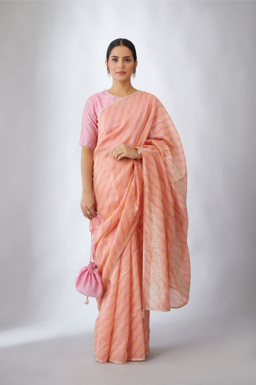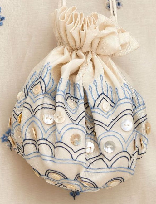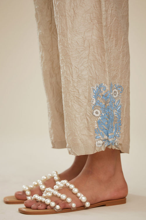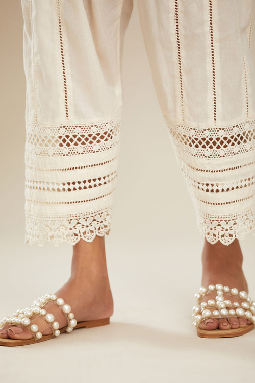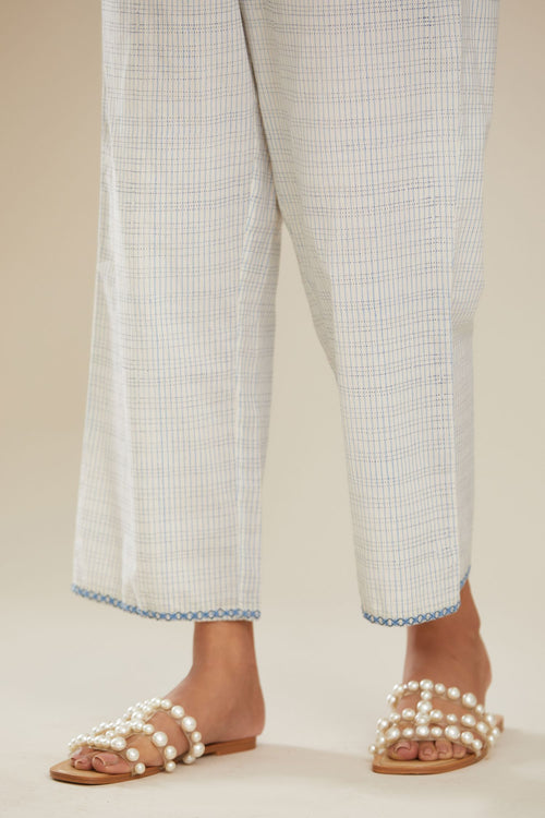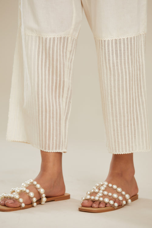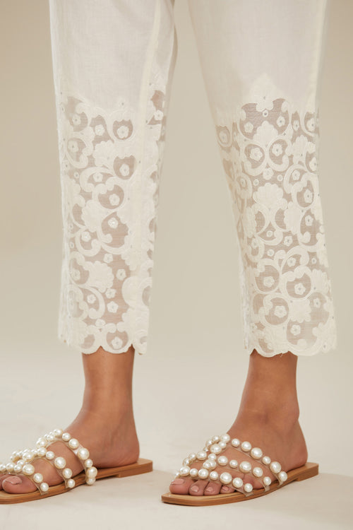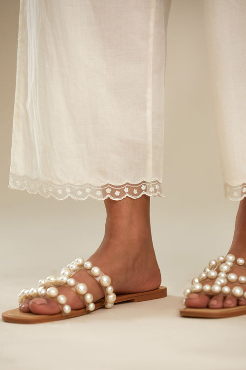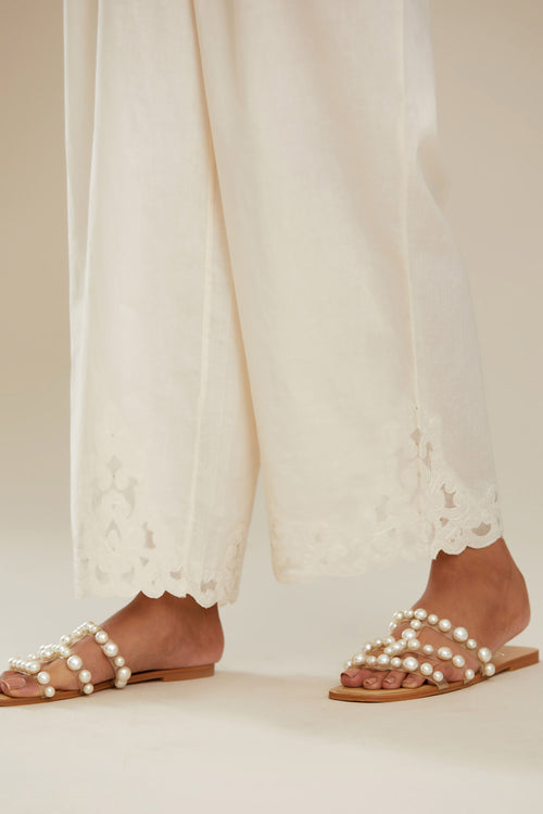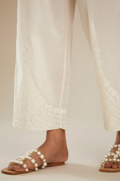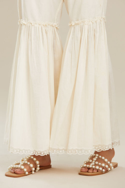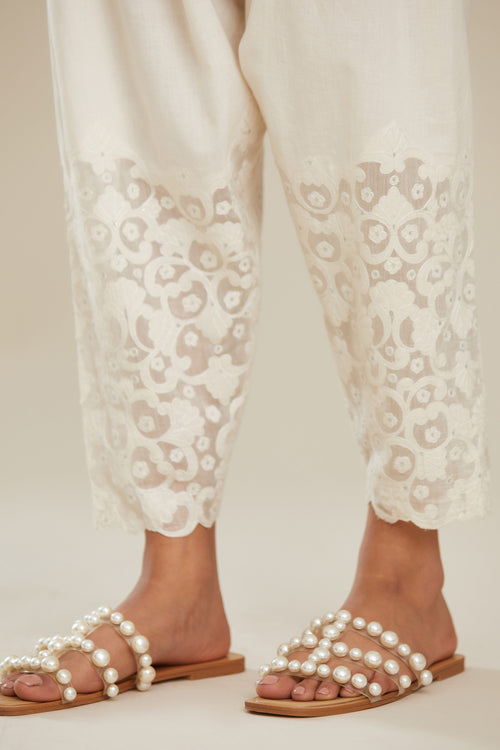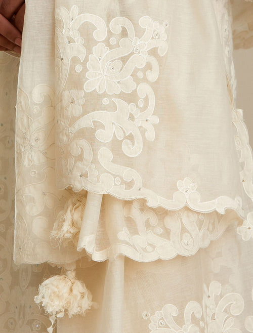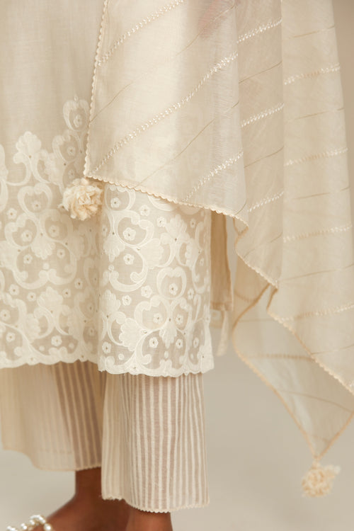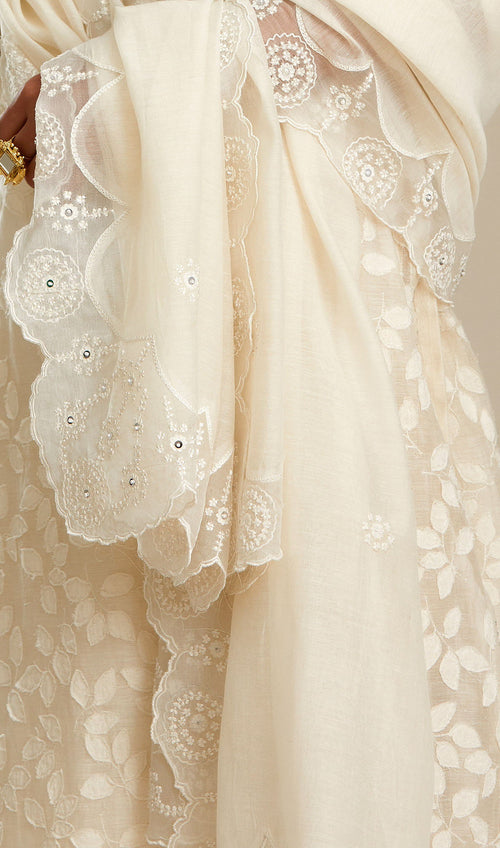 Off white silk chanderi dupatta with scalloped and embroidered edges. (Dupatta)