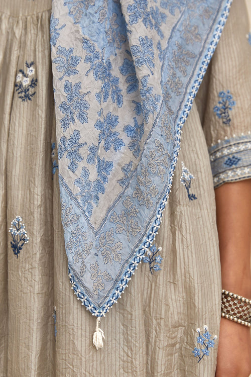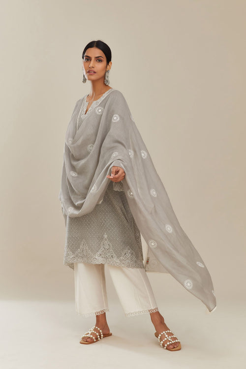 Grey cotton chanderi dupatta with all over round booti embroidery.