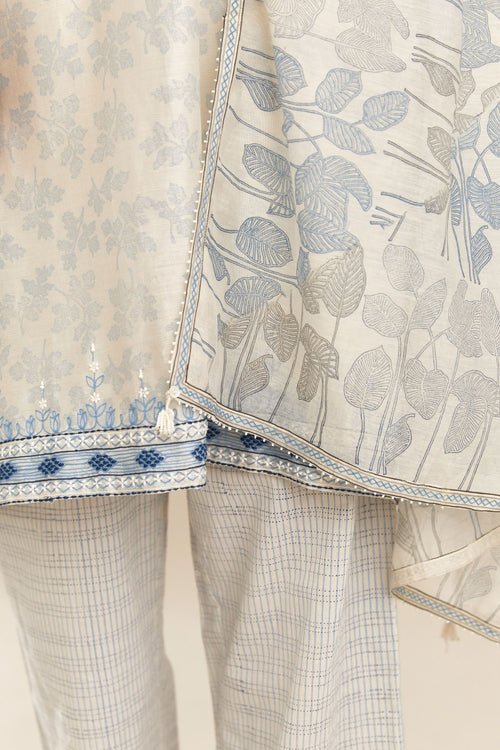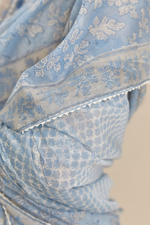 Blue & off white hand block printed cotton Chanderi dupatta.