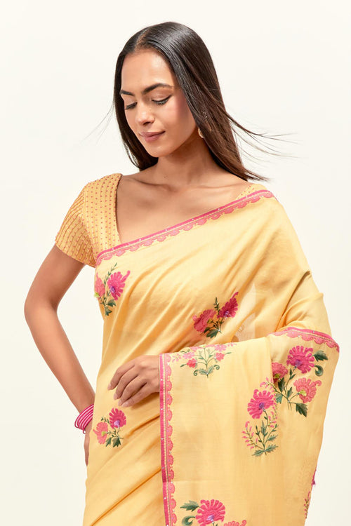 The Aparna Collection, in soft pink, dusty blue, and yellow Silk Chanderi, is richly embellished with appliquéd flowers, fine aari thread work, tassels, and delicate sequins. Simple yet elegant silhouettes, paired with airy organza dupattas, complete the look—perfect for the languid charm of the sultry season.