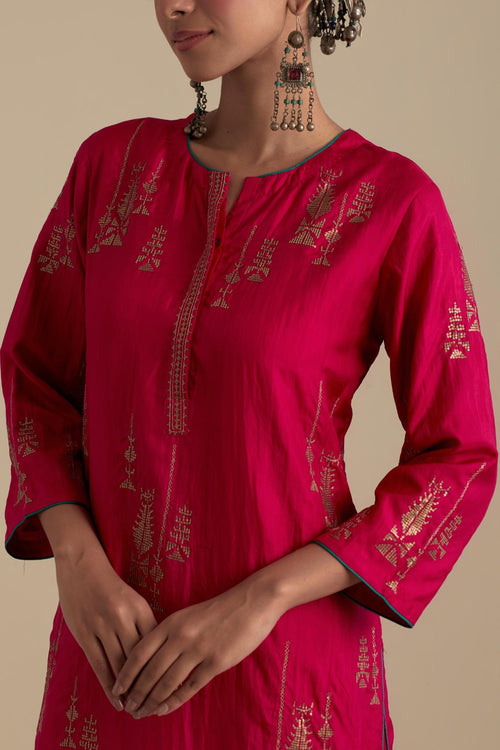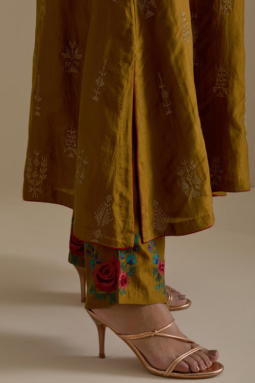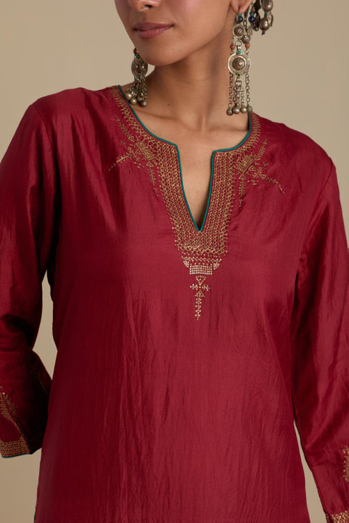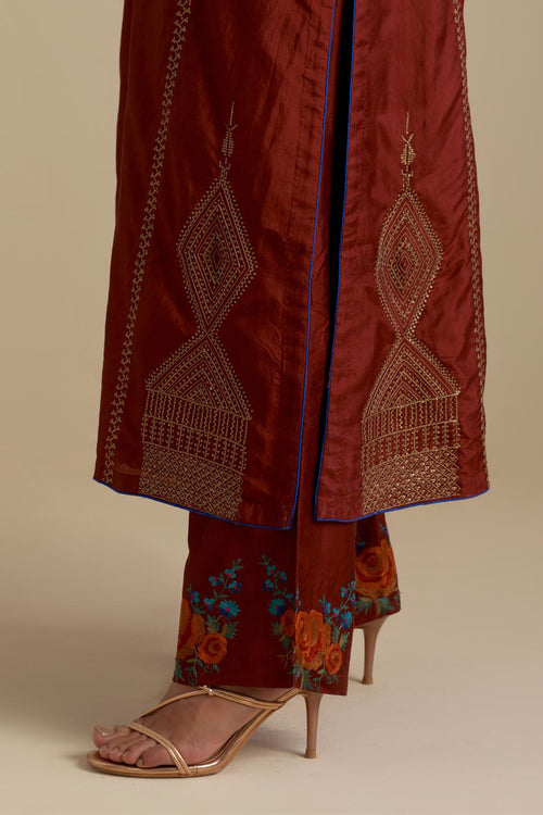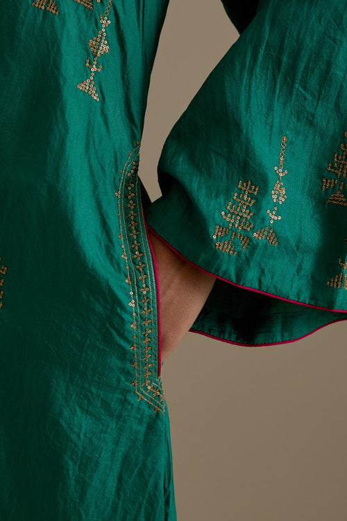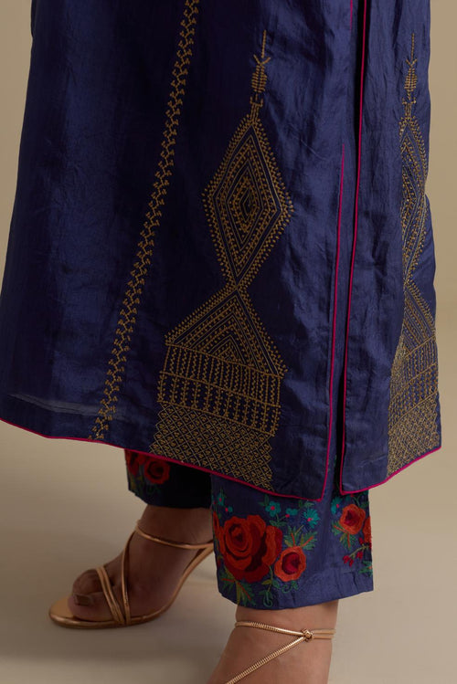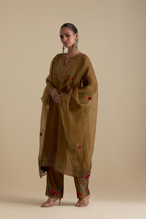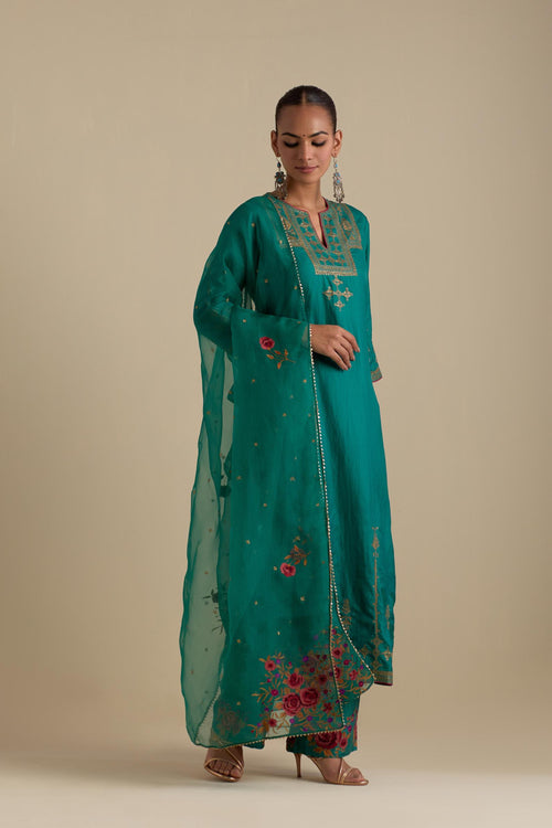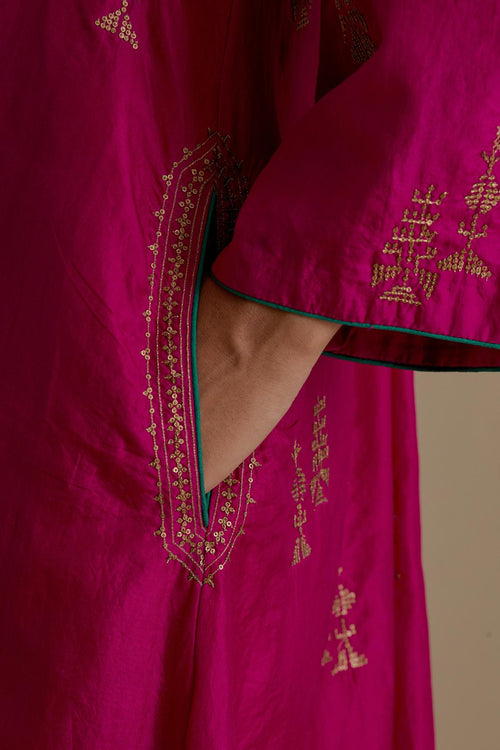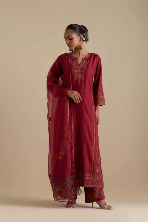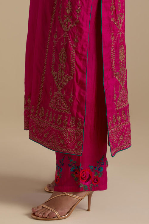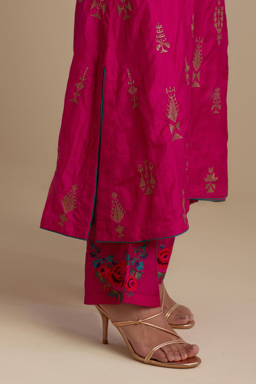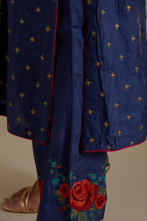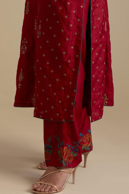 The garments are made of pure silk, in colours of Teal, Red, Wine, Blue, Fuchsia and Mustard. The unique placements and delicate hand-embroidered, sequin motifs, create pieces that are unique and graceful. The dupattas and pants have delicate thread-work roses, creating an element of interest and surprise.