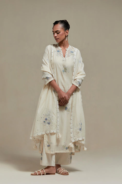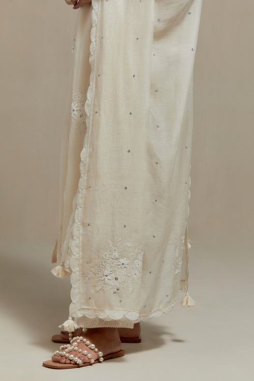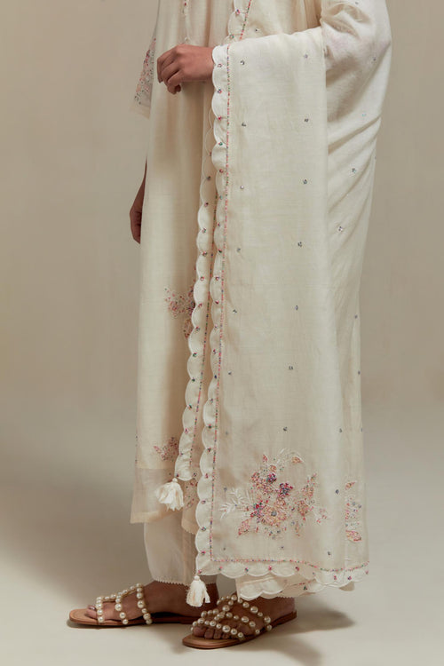 Off white cotton Chanderi dupatta with scalloped and embroidered edges.