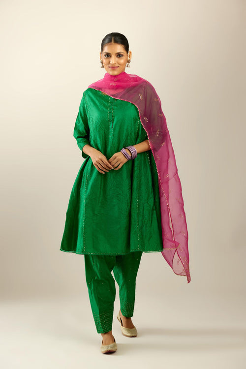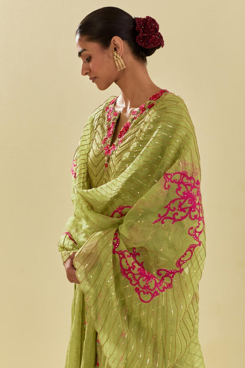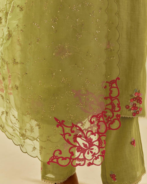 Green cotton chanderi dupatta with scalloped and embroidered edges.