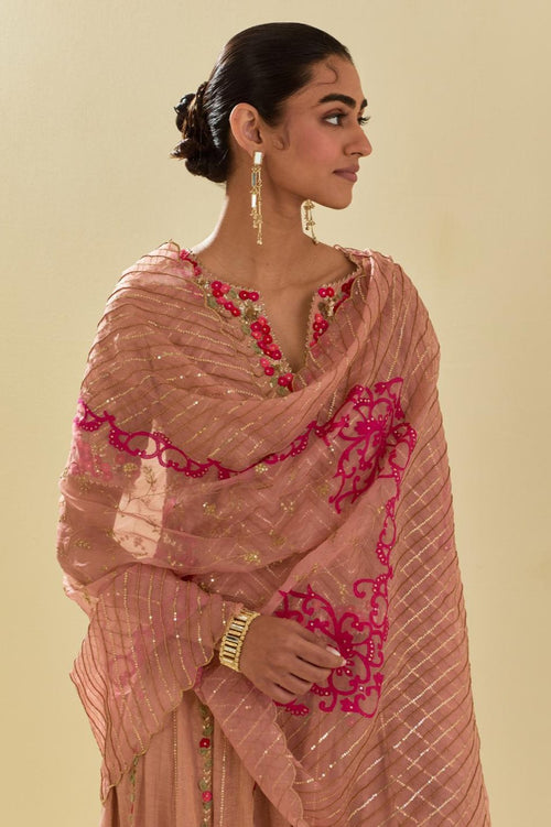 Pink cotton chanderi dupatta with scalloped and embroidered edges.