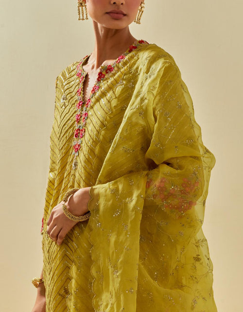 Yellow cotton chanderi dupatta with scalloped and embroidered edges.