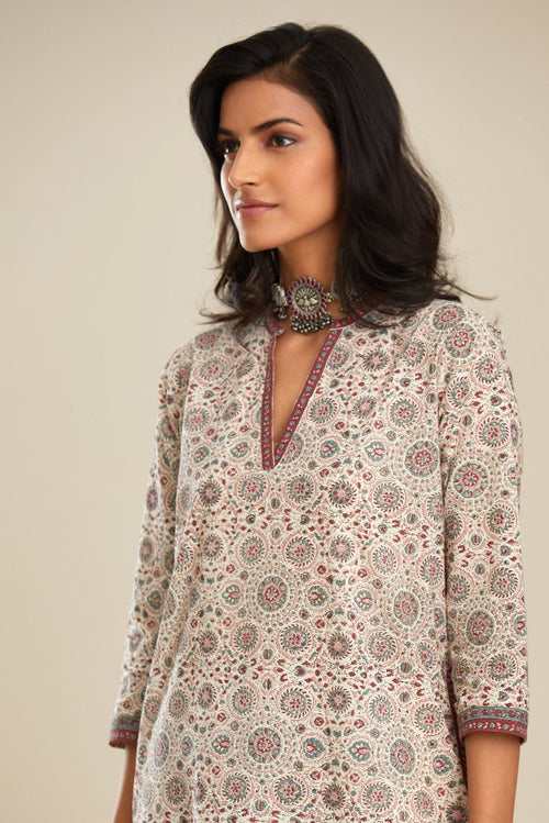 Pink short kurta detailed with all-over zari, dori, sequins and gota embroidery.