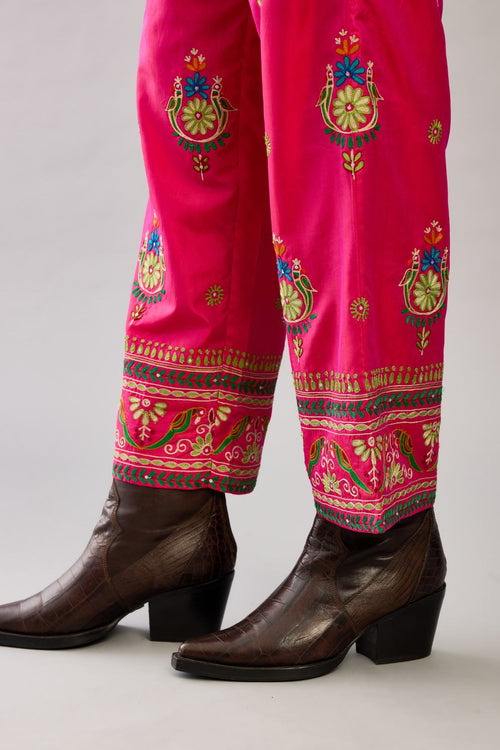 Fuchsia silk straight pants with multi color embroidery detailed with sequins.