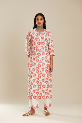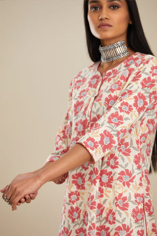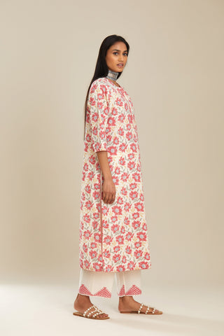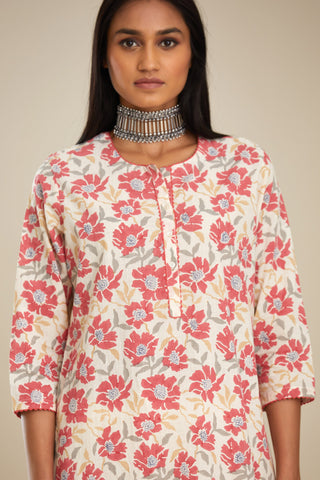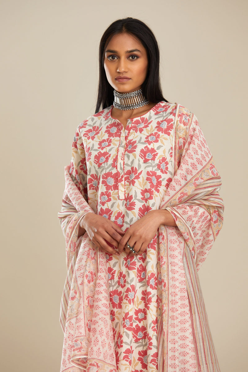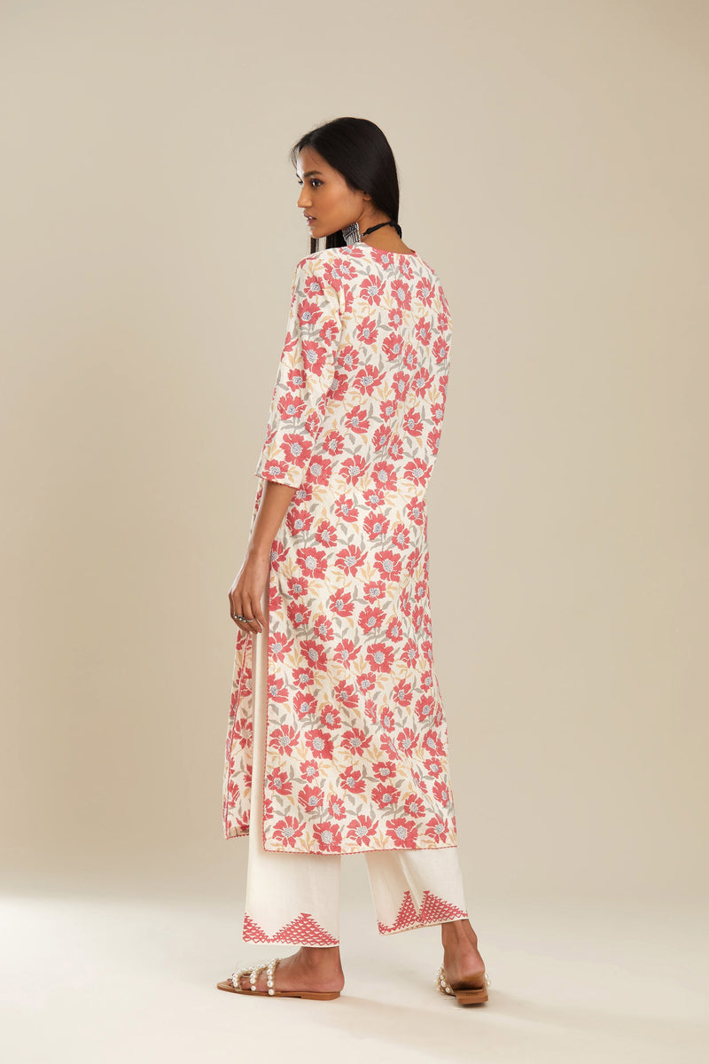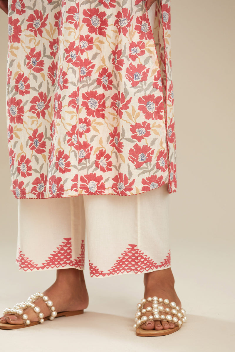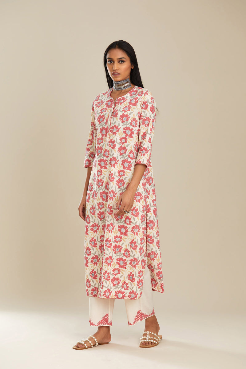 Red and off white straight kurta set with all-over poppy flower hand b – Kora India icon