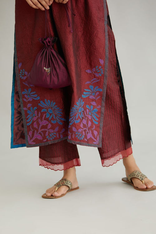 Maroon hand crushed silk kurta with contrast silk fabric applique work at hem, side slits and sleeves with an embroidered neckline.