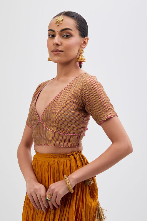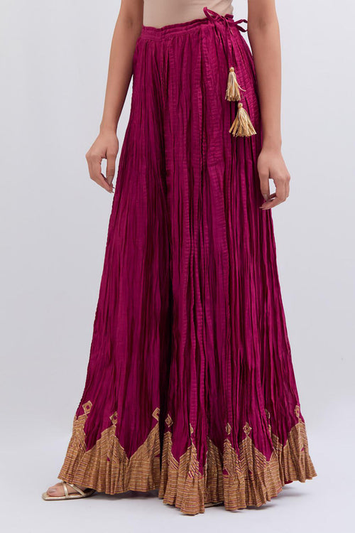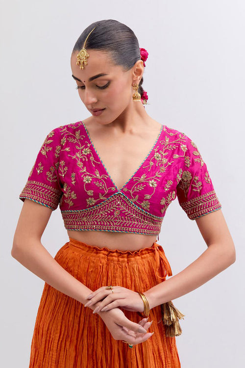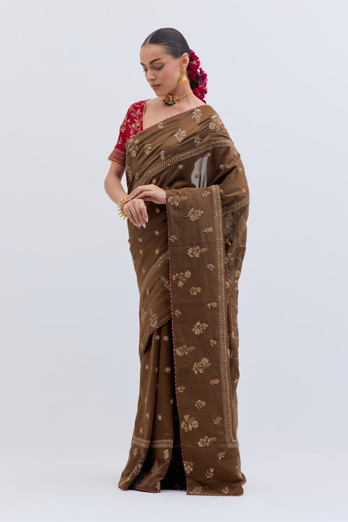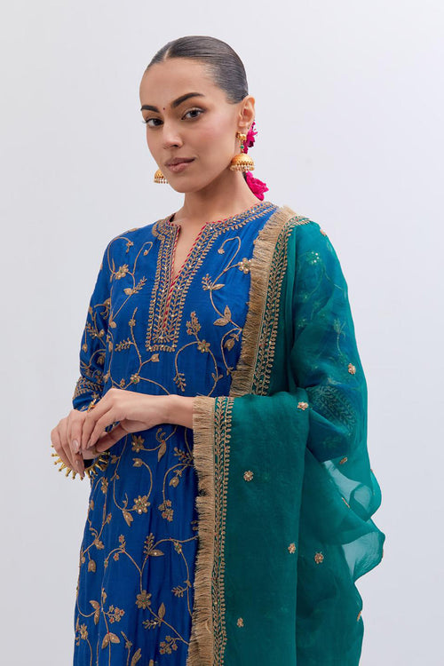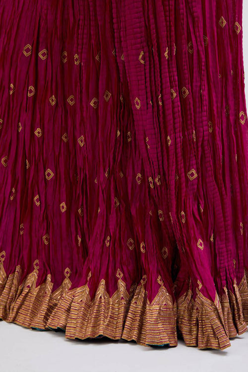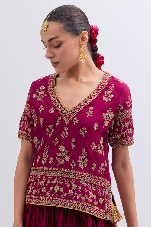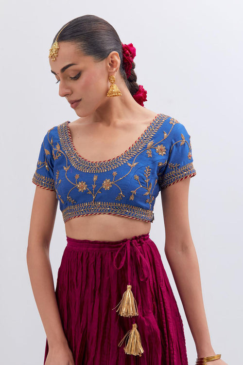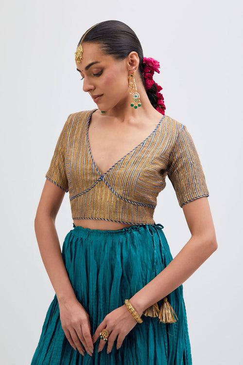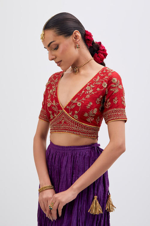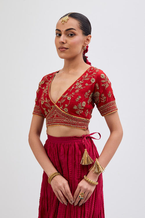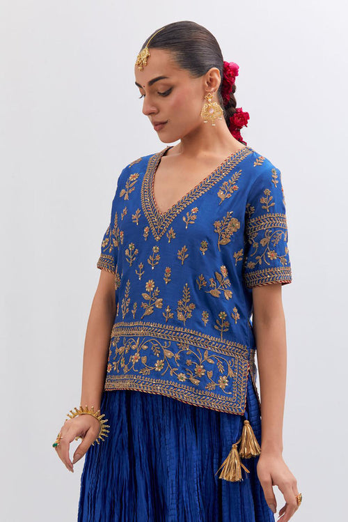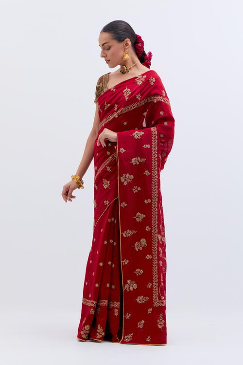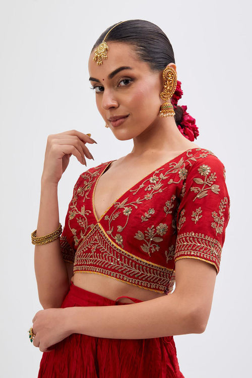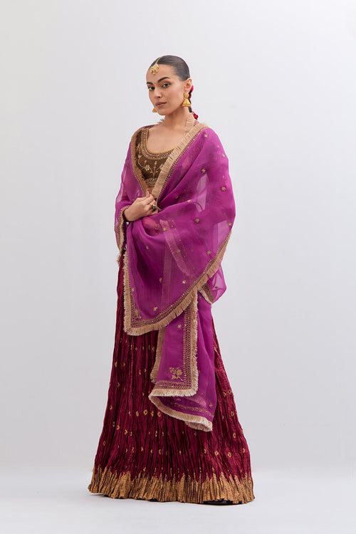 Inspired by the timeless symbolism of victory, Jayati brings together fluid silhouettes, luminous fabrics, and intricate embellishments that echo triumph’s brilliance. Hues of crimson, gold, red, rust and deep indigo evoke festivity and courage, while delicate handwork and refined detailing add an air of regal poise. 40 kali flared lehengas with delicate gota embroidery add to the drama.