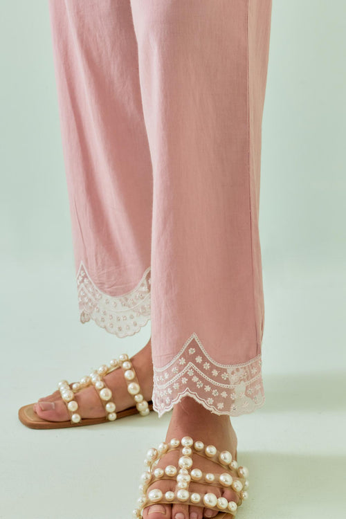 Soft hues of Ecru, Pink, Green and Yellow are offset with delicate white thread embroidery highlighted with sequins. The fabrics used are fine handwoven Cotton, Chanderi with hints of Silk Organza in the dupatta edges and pants. The garments are feminine and graceful, perfect for a confident and dynamic woman of today.