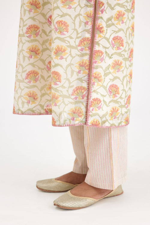 Pink and mustard hand block printed pants with dori embroidery at hem.