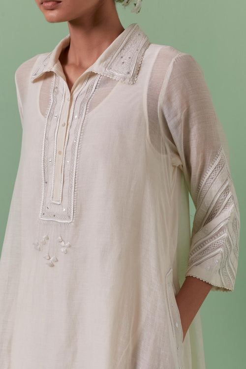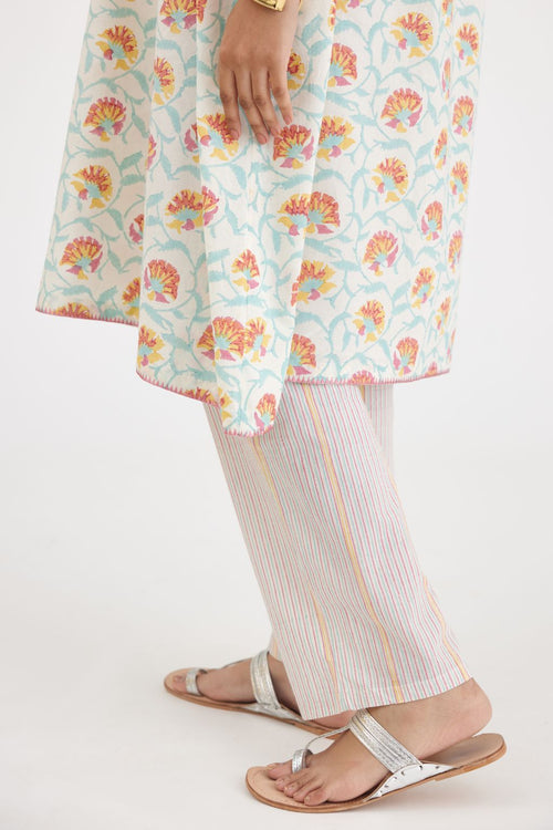 Off white cotton straight side paneled kurta set with all-over multi colored applique, highlighted with bead & sequins work.