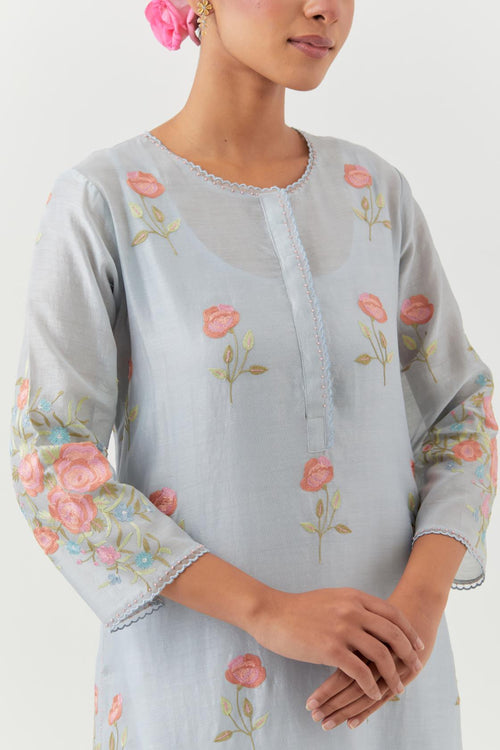 Blue silk Chanderi straight kurta with all-over roses embroidered in thread and scalloped organza detail at the edges.