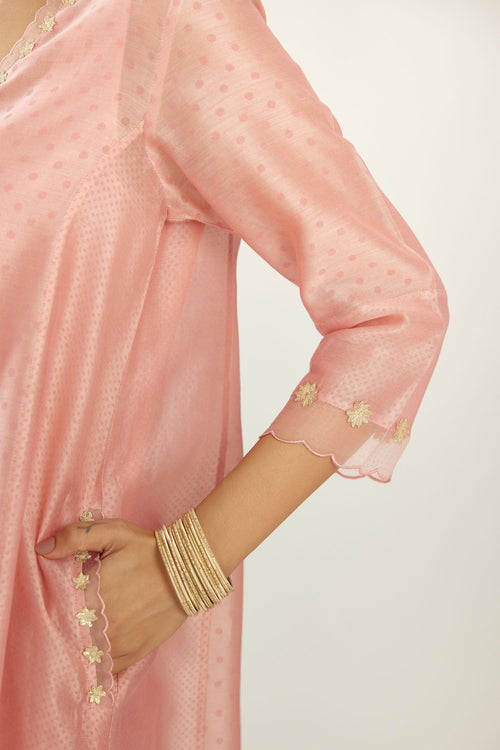 Pink silk organza dupatta detailed with all-over light gold dori embroidery, highlighted with multi colored beads & gold sequins.