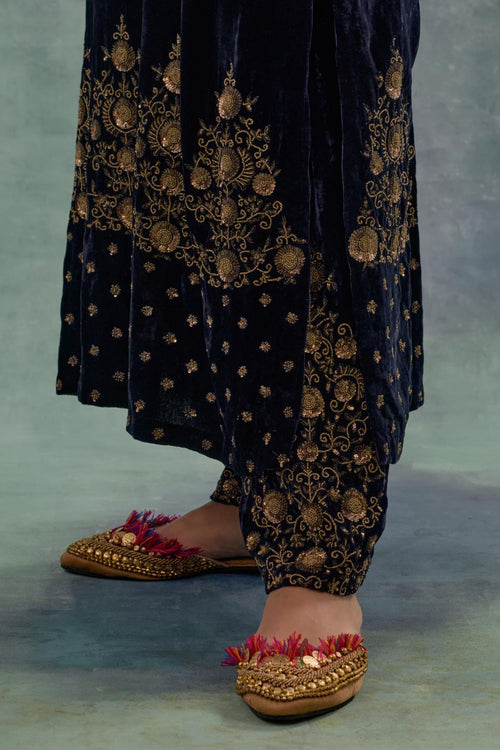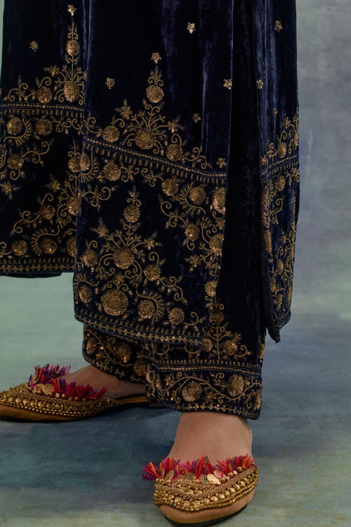 Navy straight Silk Velvet kurta set with all-over hand-embroidered bead, sequins and zari work.