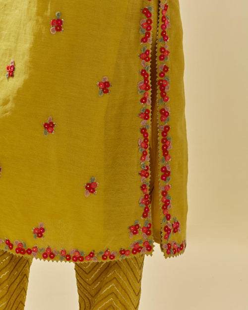 Yellow tissue chanderi straight kurta, with contrast silk hand cut flowers embroidery, highlighted with gold sequins.