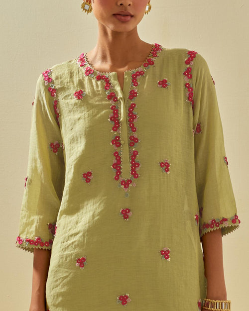 Green tissue chanderi straight kurta, with contrast silk hand cut flowers embroidery, highlighted with gold sequins.