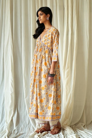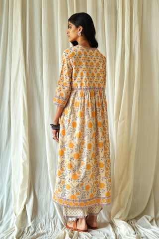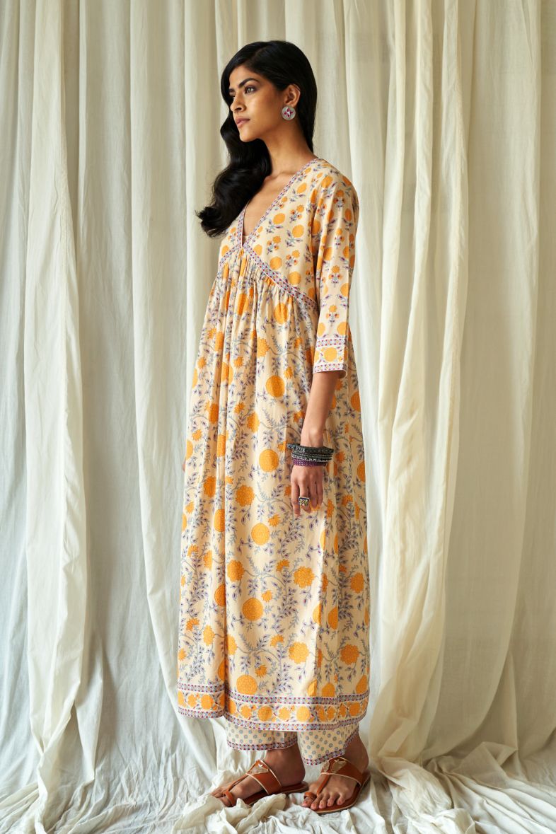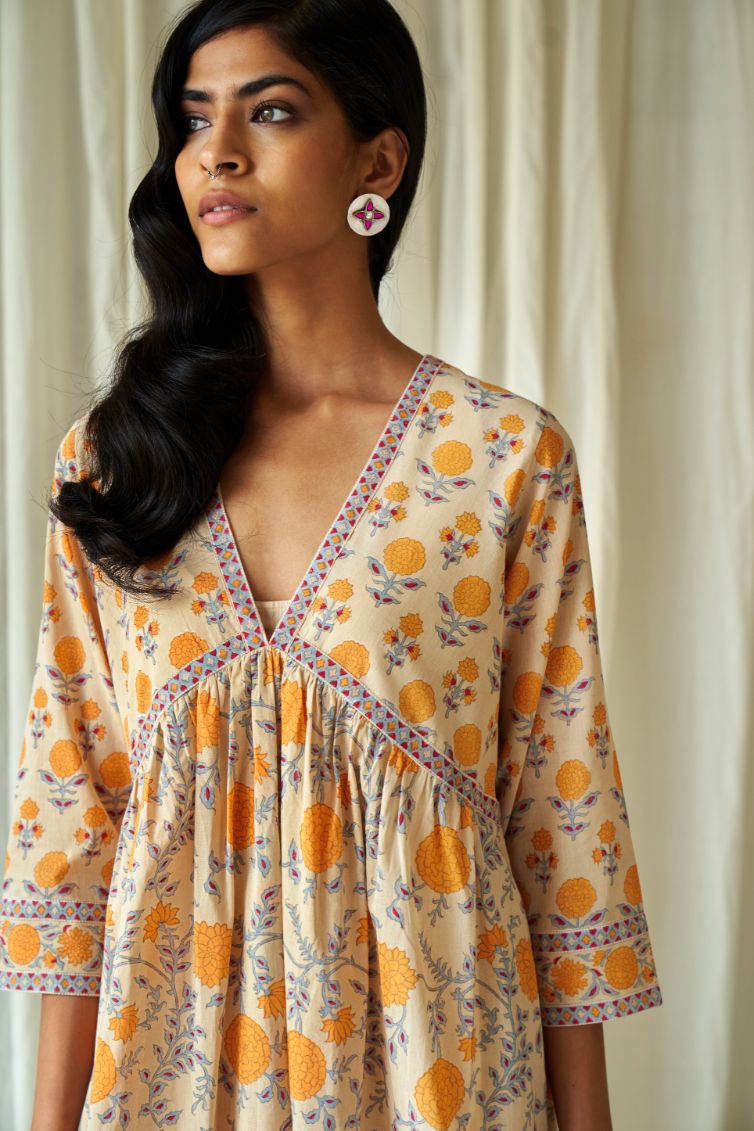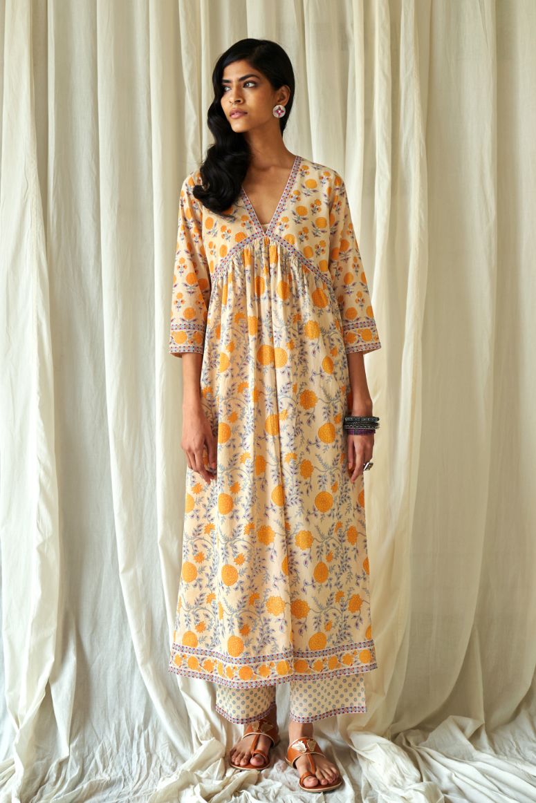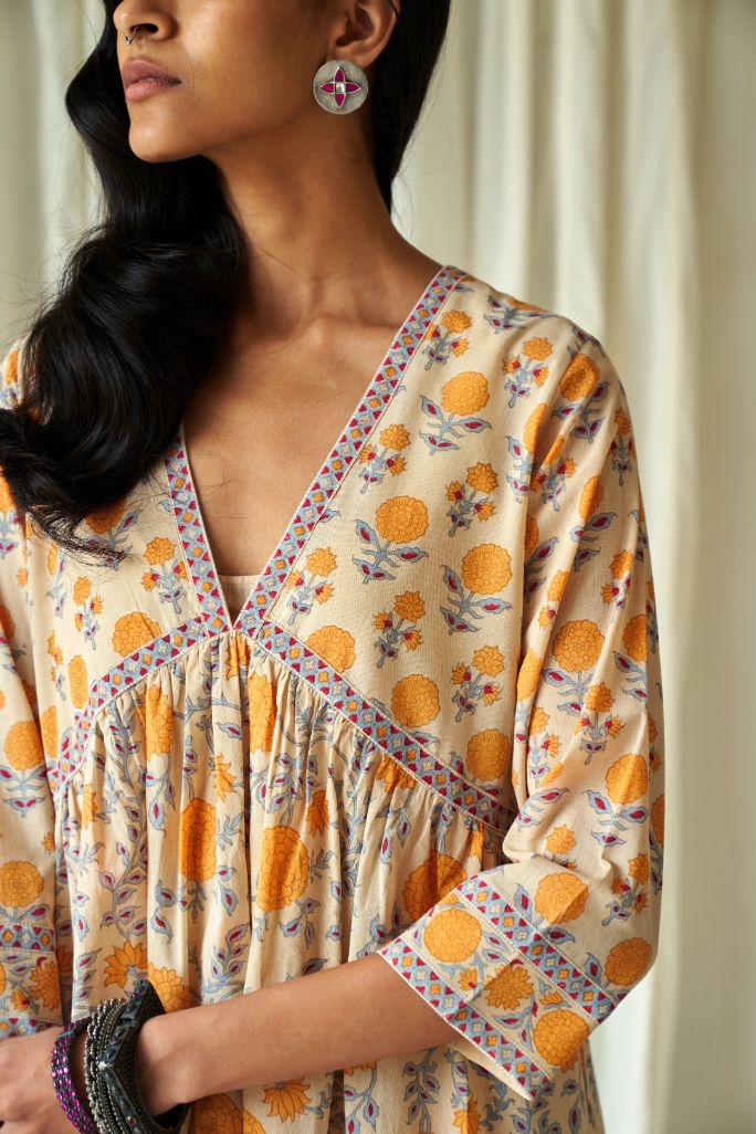 Yellow and beige hand block printed cotton kurta-dress. It has ‘V’ neck and fine gathers at empire line. Sleeves are 3/4. The edges of neck, sleeves and hem finished with printed border. Worn with cotton slip, paired with blue hand block printed cotton straight pants with narrow border at hem. It has an elasticated waist at back and drawstrings in the front for better fitting.