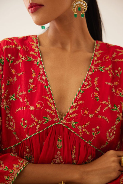 Red silk embroidered kurta dress set with fine gathers at empire line.