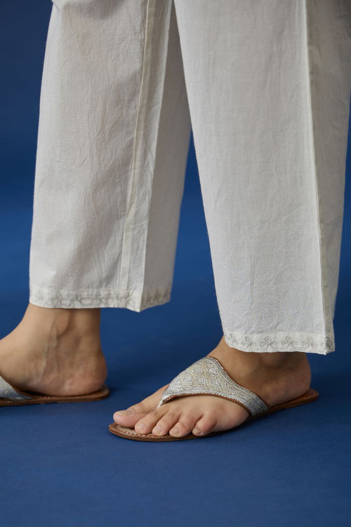 Sea green silk chanderi kurta with all-over contrast silk thread and zari embroidery. It has a embroidered round neckline with a slit in the front & 3/4 embroidered sleeves, paired with Off white cotton straight pants with silver zari embroidery detailing at bottom hem. It has an elasticated back and drawstring in the front, comes with pink & peach hand block printed cotton chanderi dupatta with all-over silver gota detailing and gota tassels at all corners.