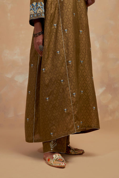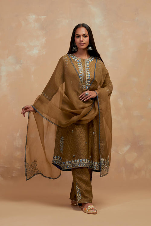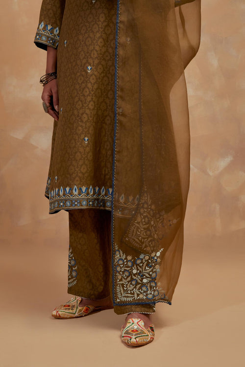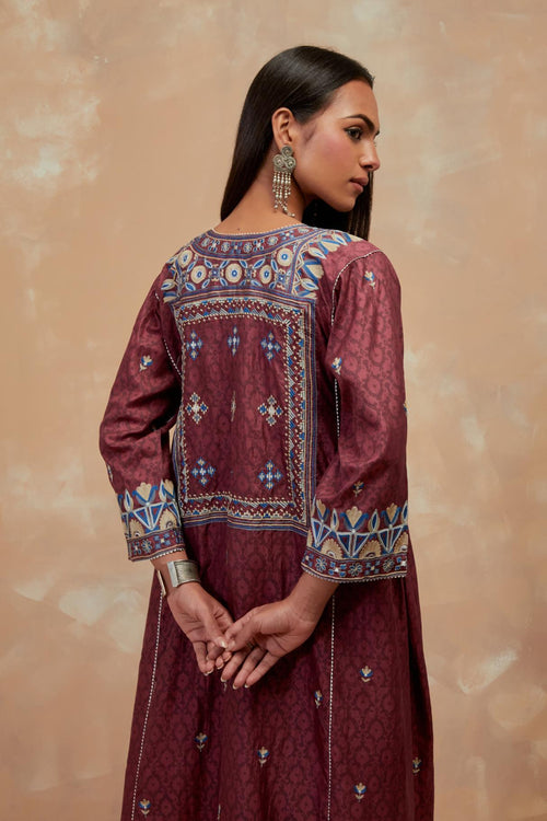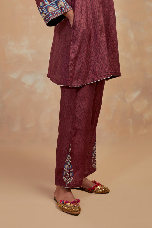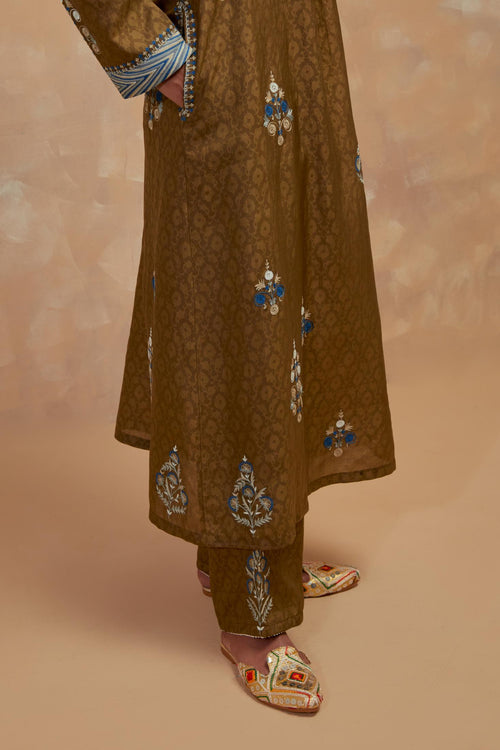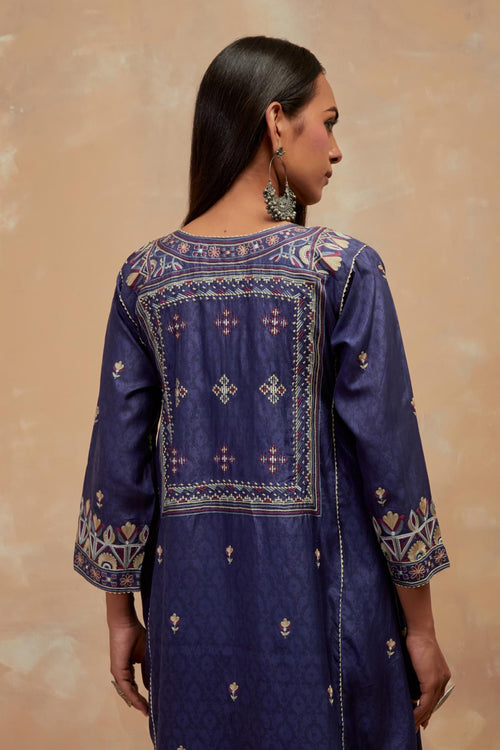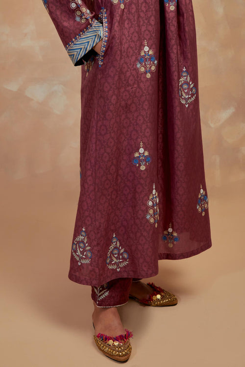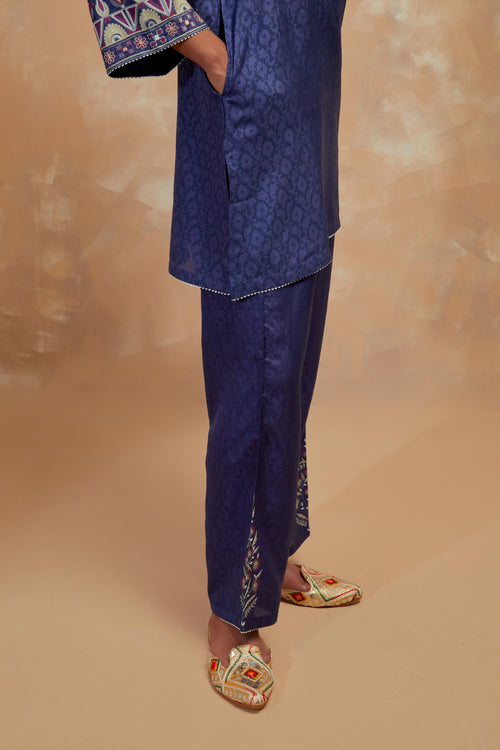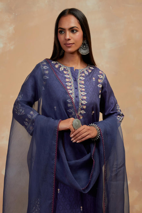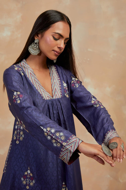 Crafted in hand-block printed silks, the ensembles carry patterns that feel both familiar and timeless. The palette of dusty blue, mustard and wine mirrors the stillness of winter skies and the comfort of hearth and home. Delicate silk-thread floral embroidery blooms softly across the fabric, while smart, silhouettes lend each piece a sense of effortless modernity.