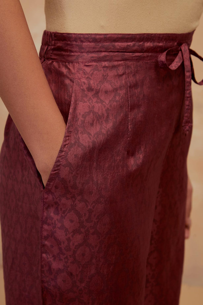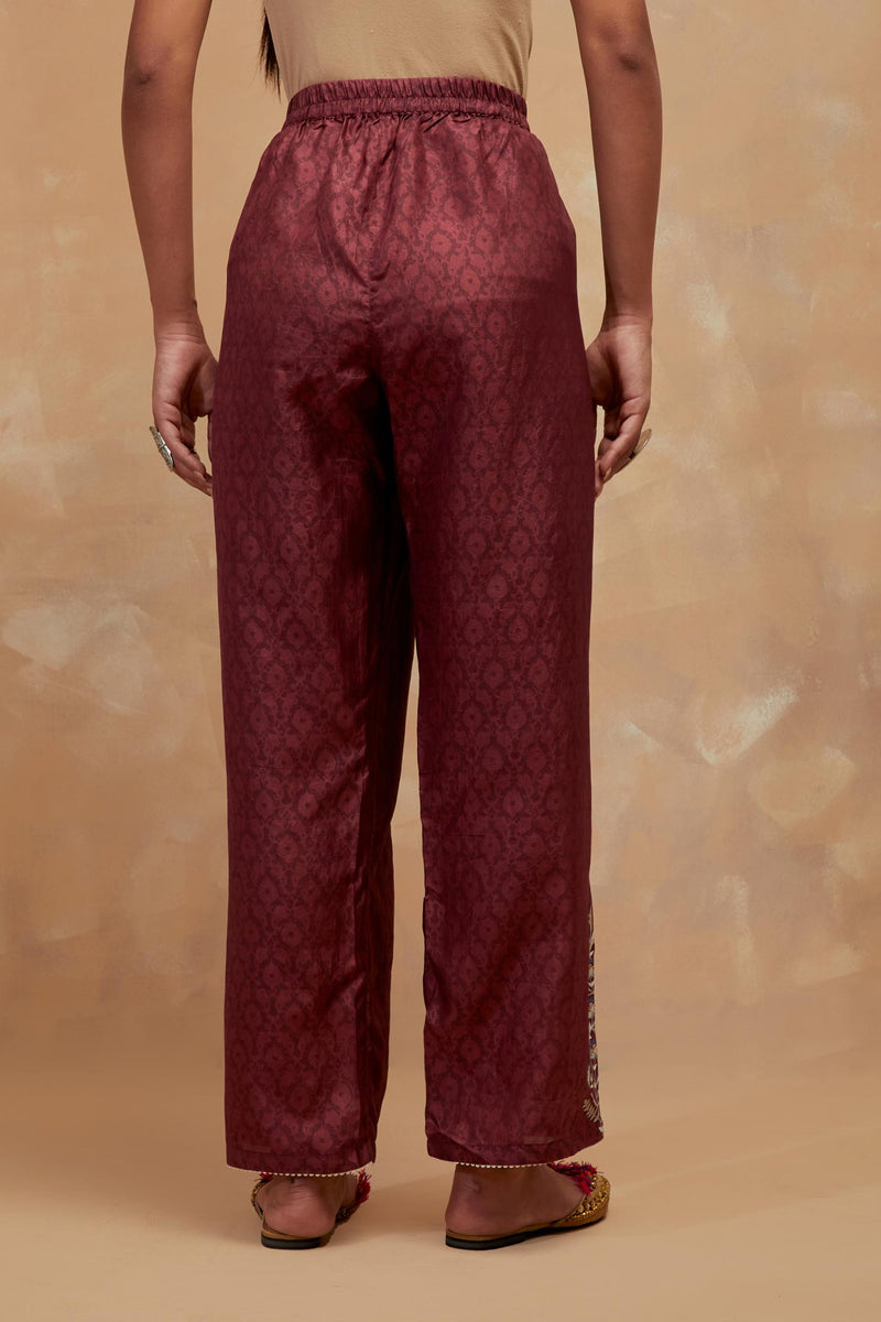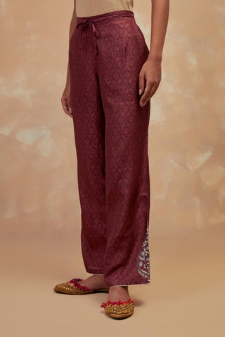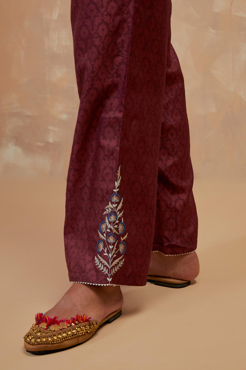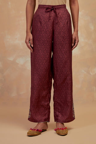 Deep berry silk straight pants with all-over hand block print, highlighted with embroidered boota at hem. It has an elasticated waist at back and drawstrings in front for better fitting and side pockets.
