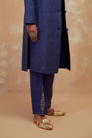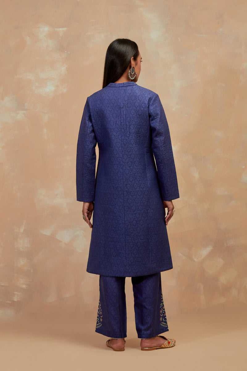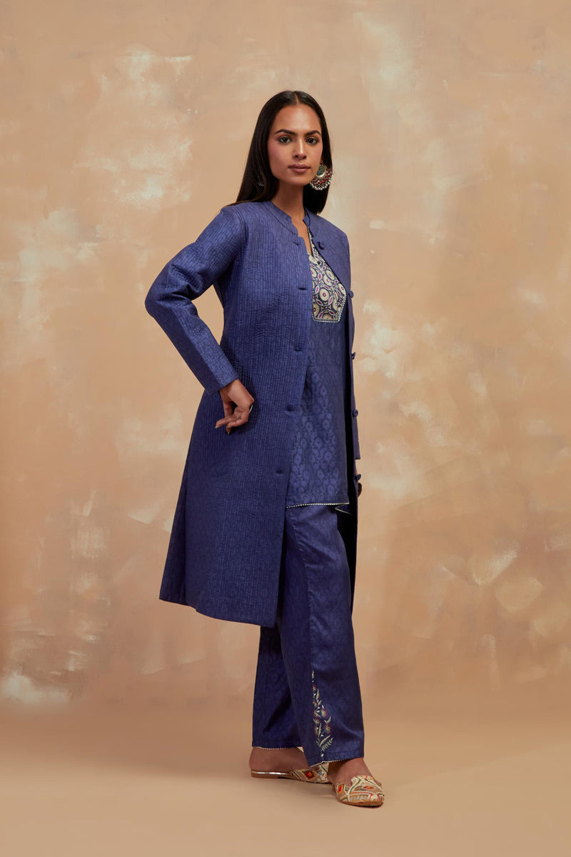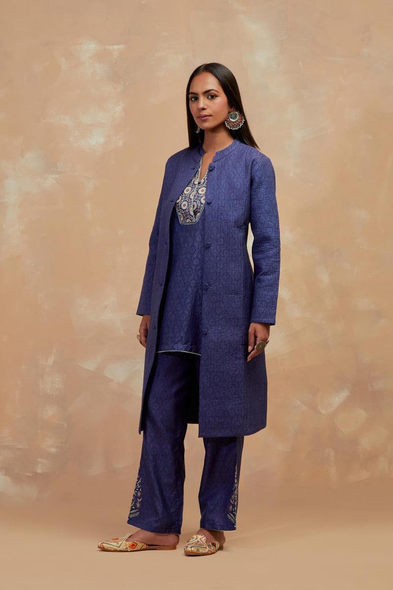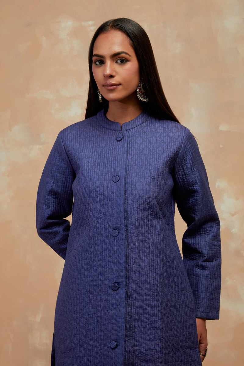 Ford blue silk, quilted mid- length front open jacket with all-over hand block print. It has a round collar and full sleeves.