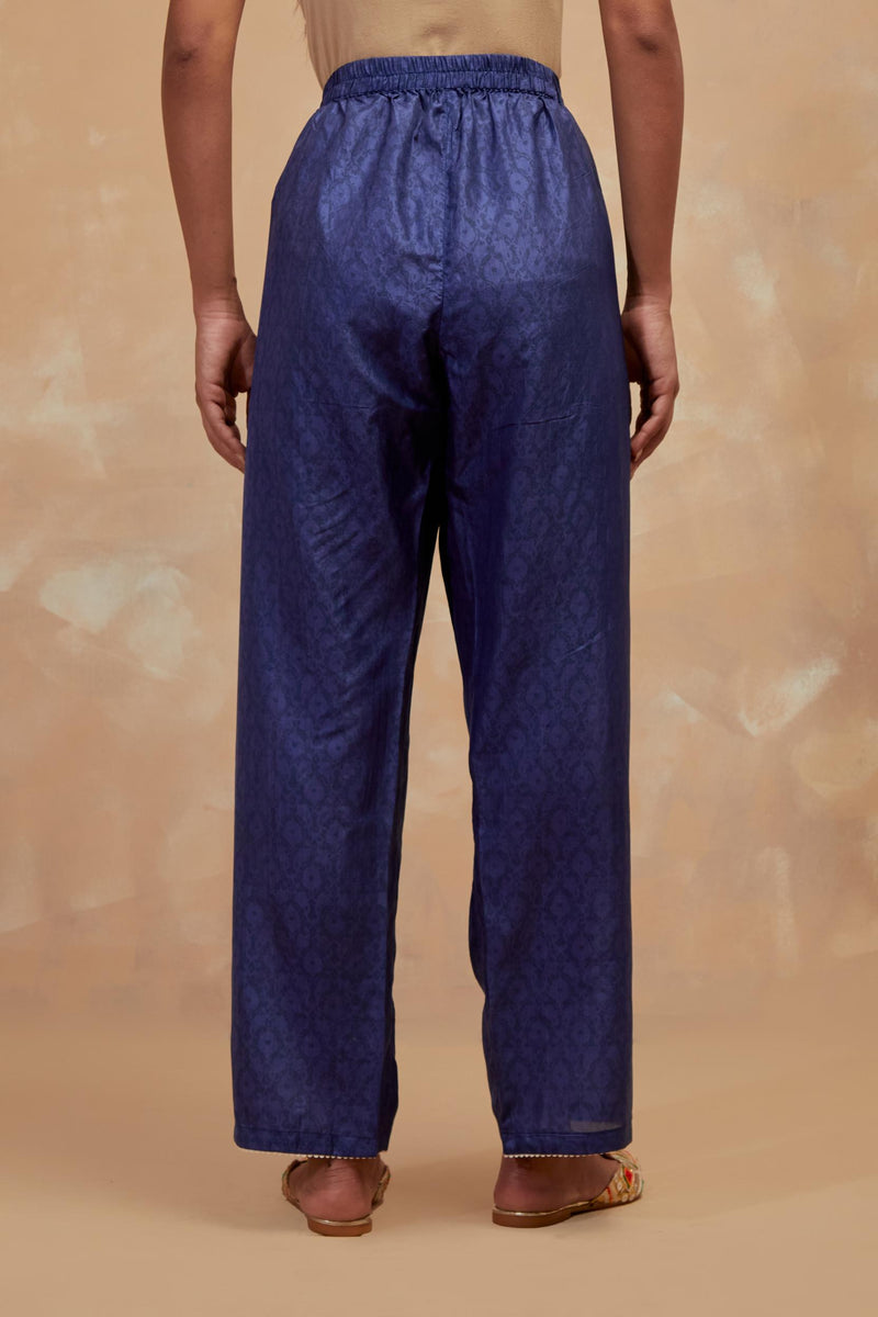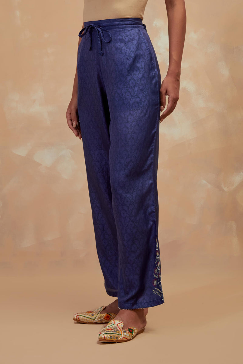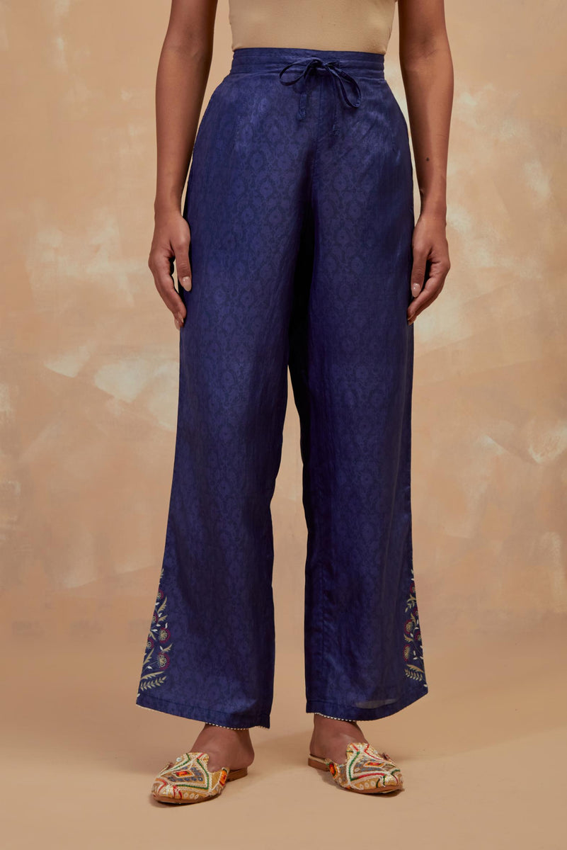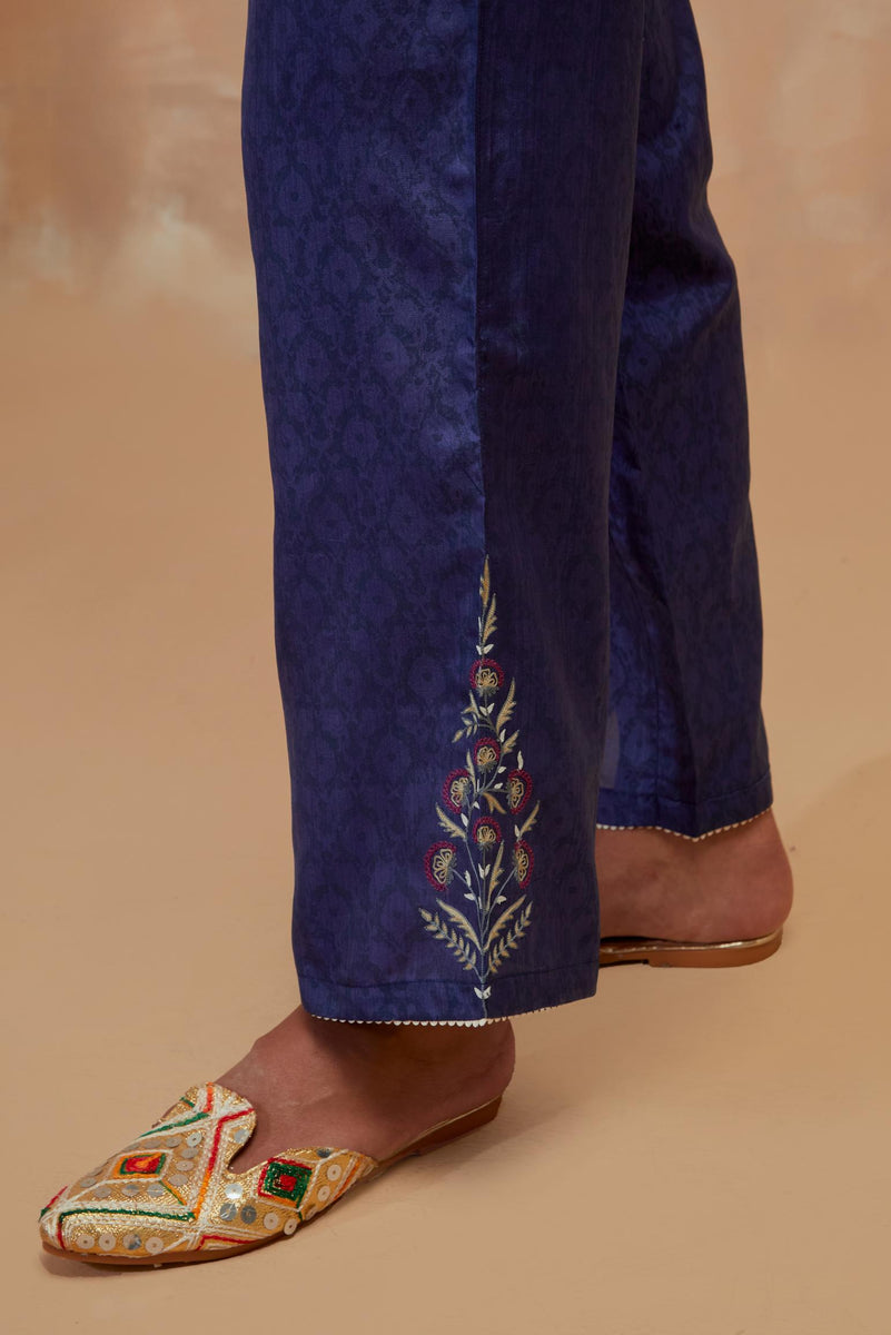 Ford blue silk straight pants with all-over hand block print, highlighted with embroidered boota at hem. It has an elasticated waist at back and drawstrings in front for better fitting and side pockets.