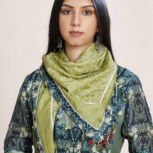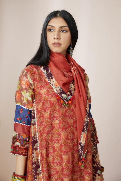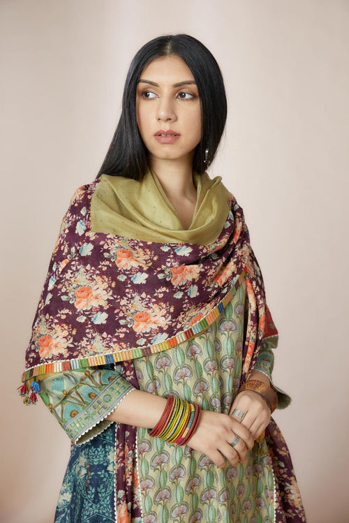 Grey and purple short kurta with all-over chintz block print. It has a shirt collar neckline with front placket and box pleat and side pockets. 3/4 sleeves & hem are highlighted with contrast printed border at edges.