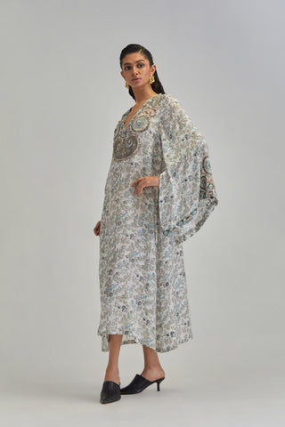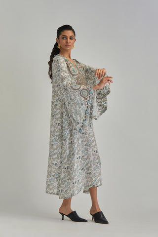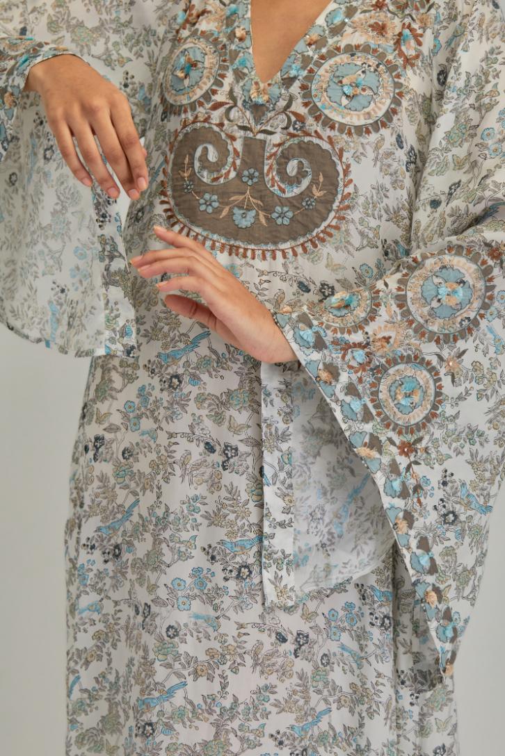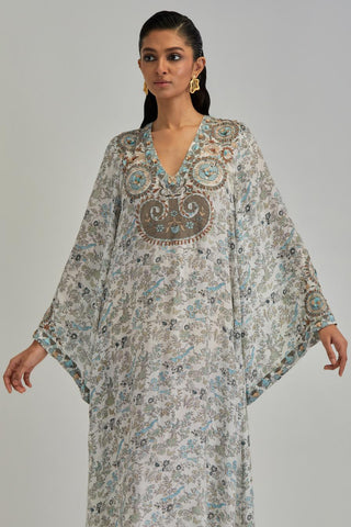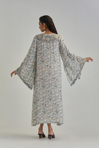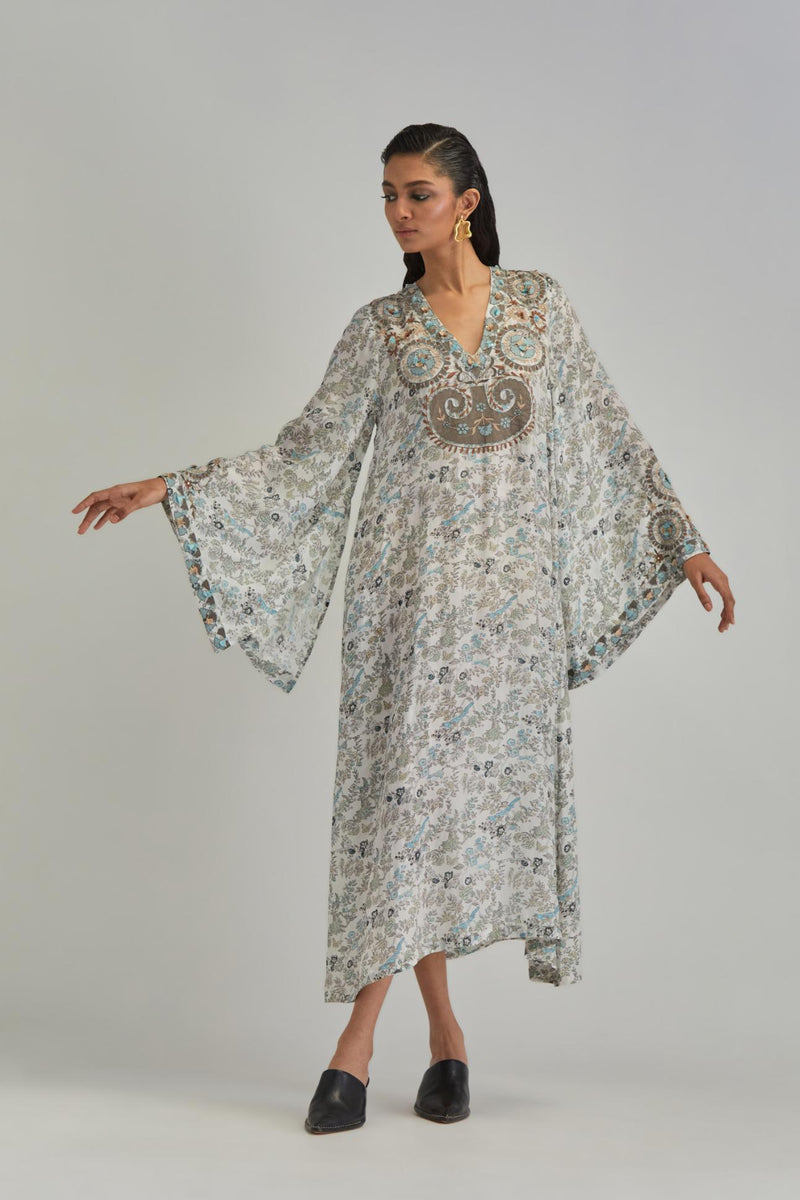Off White long A-line kaftan with all-over earthy coloured appliqué flowers, thread work and silk tassels. It has a V neckline and long bell sleeves. The edges off sleeves highlighted with applique and thread work.