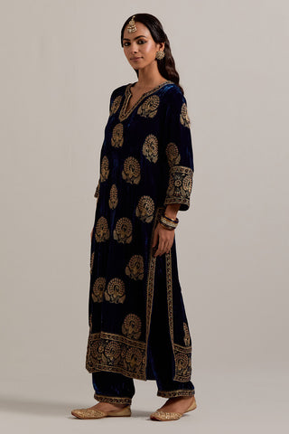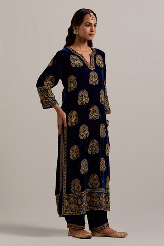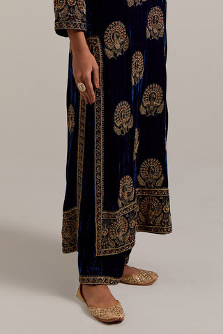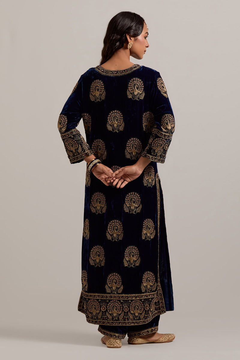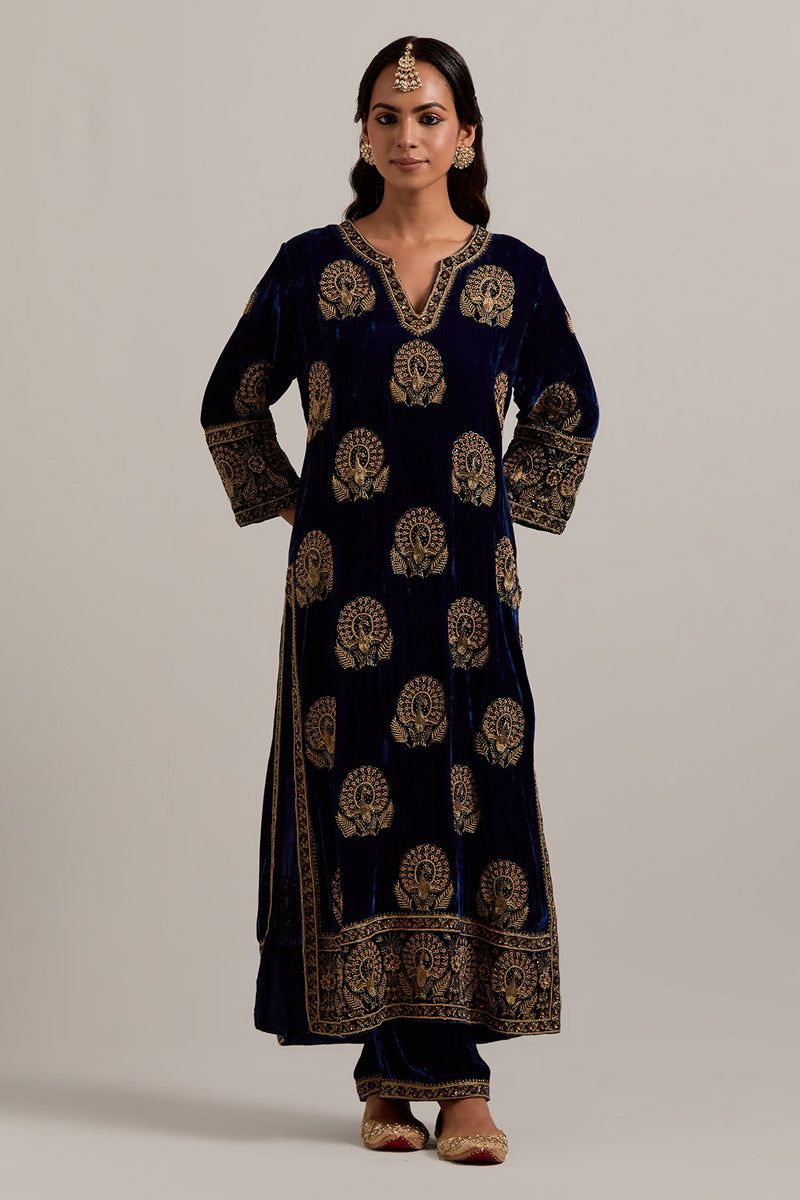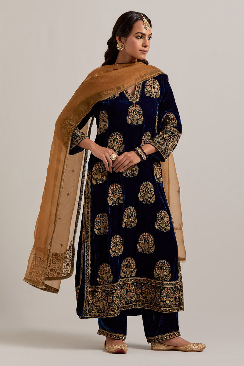 Navy blue silk velvet straight kurta with sequins, zardozi, zari embroidered peacock boota all-over the kurta and big border at hem, highlighted with contrast bead work. The kurta has a round neck with a slit in the front and 3/4 sleeves. This kurta has silk chanderi facings at sleeves, side slit, neck and hem. Paired with Navy blue Silk velvet pants, highlighted with hand embroidered bead, sequins, zardozi and zari narrow border at bottom hem, highlighted with contrast bead work. The waistband is elasticated at the back and has drawstrings in the front for better fitting. It also has side pockets. Comes with Olive Silk Organza dupatta detailed with all-over sequins, zardozi and zari hand work, highlighted with contrast bead work. The dupatta edges are finished with gold zari jhallar fringe lace.