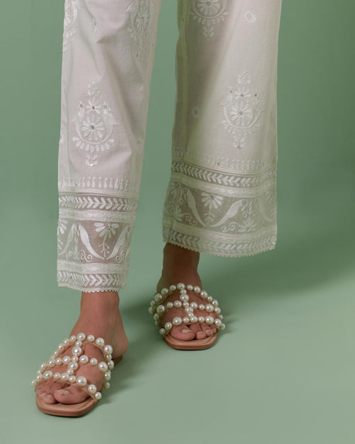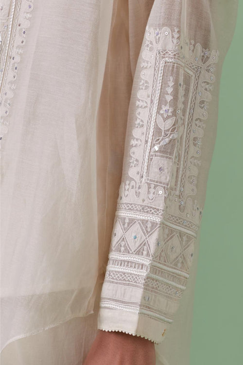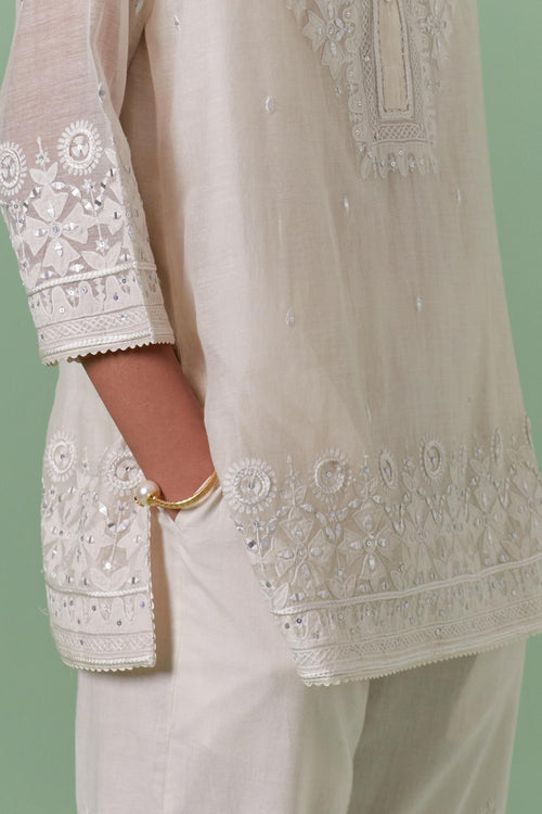 Off-white cotton chanderi kurta dress with 3/4th sleeves. It has V-neck and fine gathers at empire line. Yoke, sleeves & hem are detailed with patch-work, silk thread embroidery, highlighted with mirror, sequins, tassels and braids. The kurta comes with fine cotton slip, paired with off-white straight pants with all over off white silk thread embroidery detailed with sequins. The waistband is elasticated at the back with drawstrings in the front for better fitting. It also has side pockets. Comes with off-white dupatta with all-over delicate silk thread embroidered butis, highlighted with sequins. It has a patched running border at the edges. Tassels are attached at all four corners.