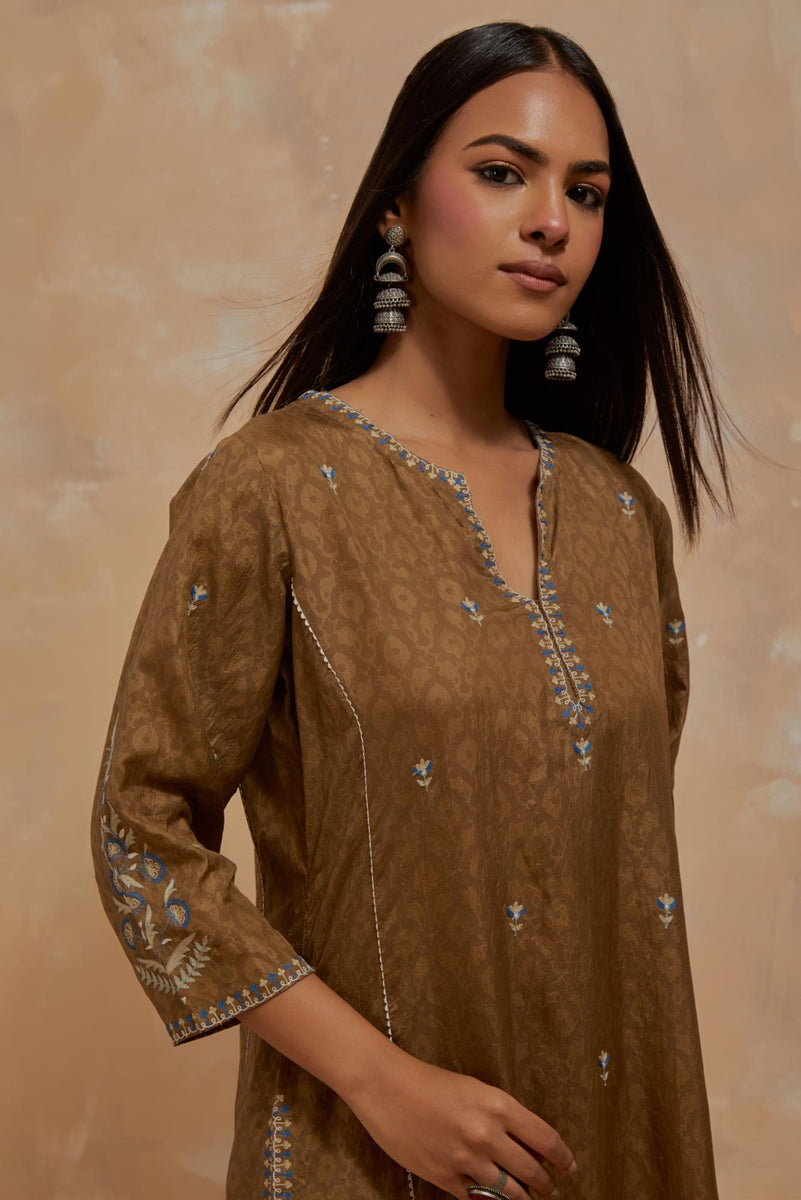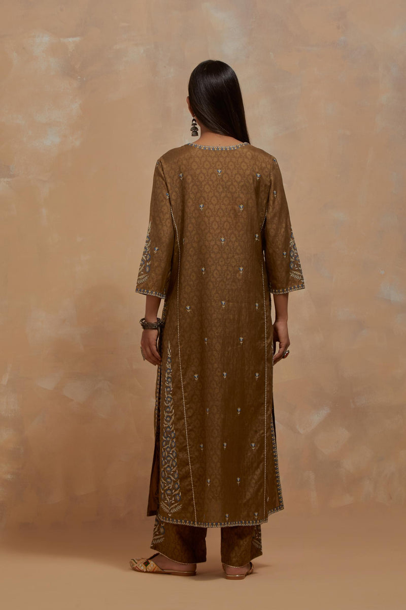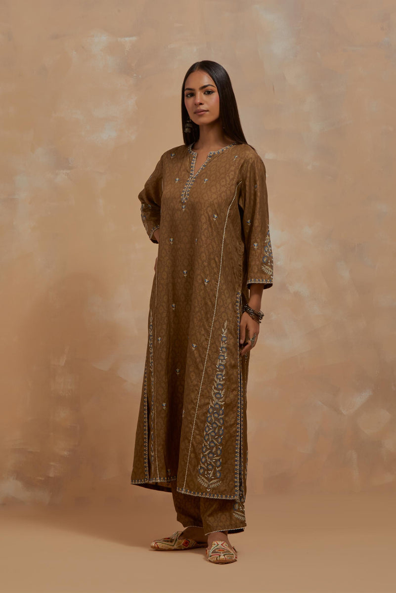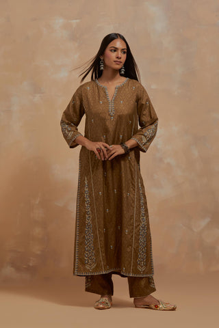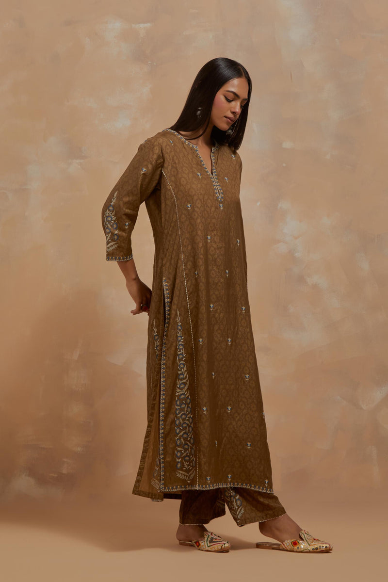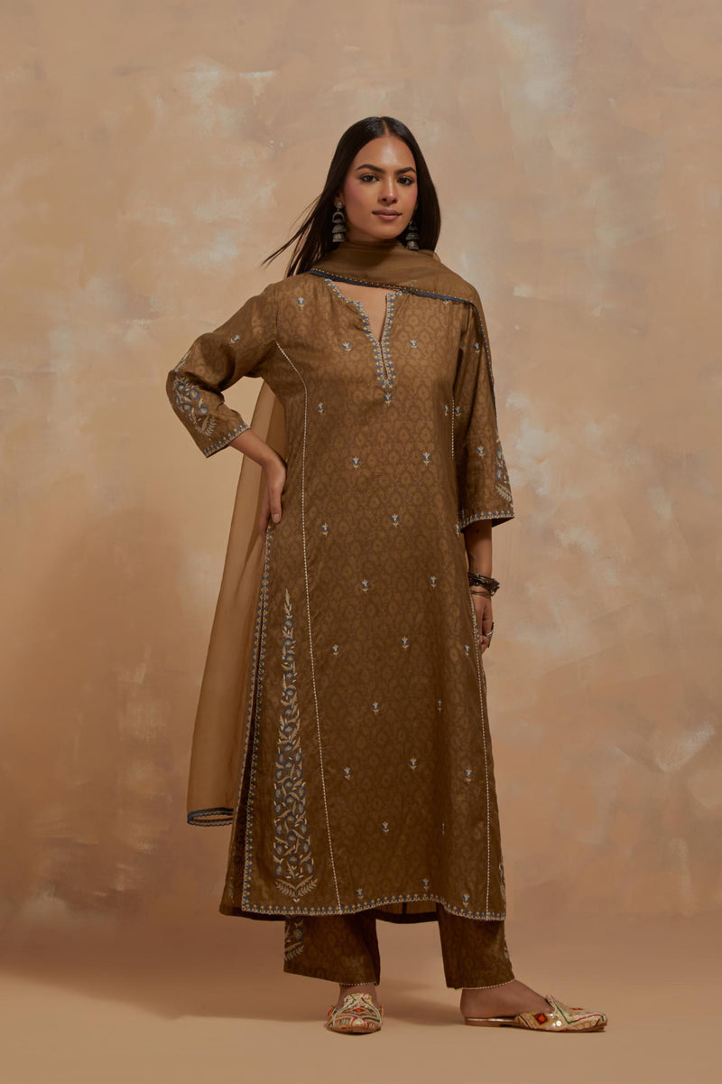 Olive green silk hand block printed kalidar straight kurta, highlighted with multi colored silk thread embroidery. The kali joint is detailed with off white ricrac. The main body of the kurta has small floral embroidery, while the side panels have long kairy boota at sides. Paired with Olive green silk straight pants with all-over hand block print, highlighted with embroidered boota at hem. It has an elasticated waist at back and drawstrings in front for better fitting and side pockets. Comes with Dark olive silk organza dupatta with multi colored silk thread embroidery at dupatta all four corners. The edges of the dupatta finished with a delicate organza scalloped embroidery, highlighted with contrast bead work.
