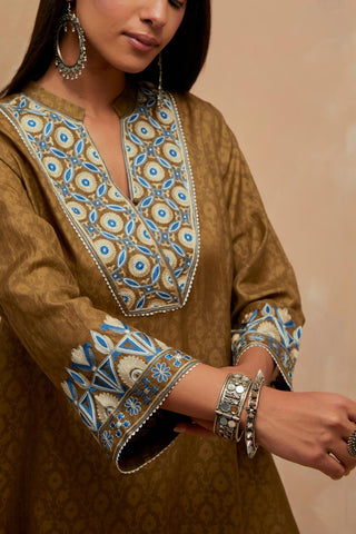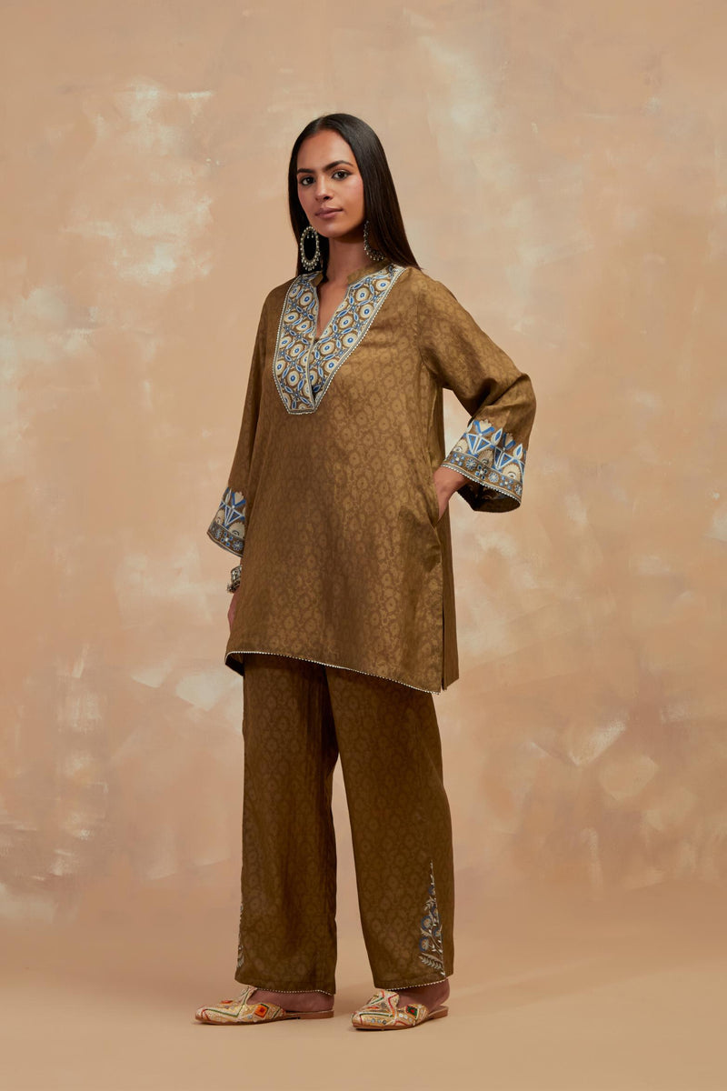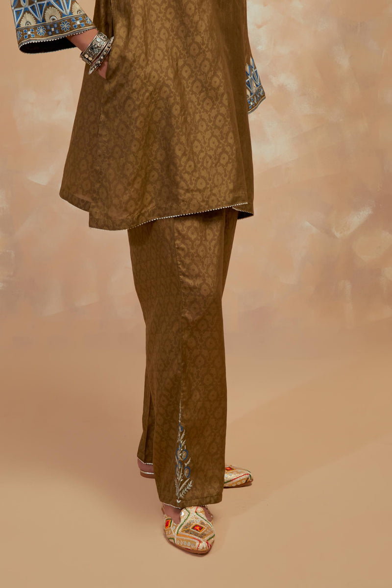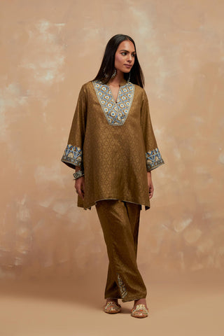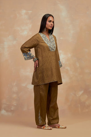 Olive green silk hand block printed short top, highlighted with multi colored silk thread embroidery. It has a round overlapped neckline with an one functional button and 3/4 sleeves. Paired with Olive green silk straight pants with all-over hand block print, highlighted with embroidered boota at hem. It has an elasticated waist at back and drawstrings in front for better fitting and side pockets.