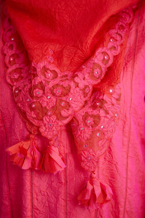 Purple crushed silk hand block printed shirt, highlighted with multi colored thread embroidery. It has a shirt collar neckline with button placket in the front and full sleeves. Paired with Purple crushed silk hand block printed pants, highlighted with multi colored thread embroidery. It has an elasticated waist at back and drawstrings in front for better fitting and side pockets.