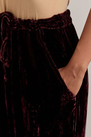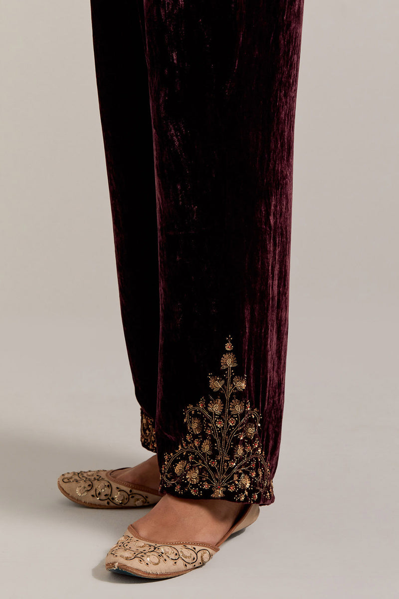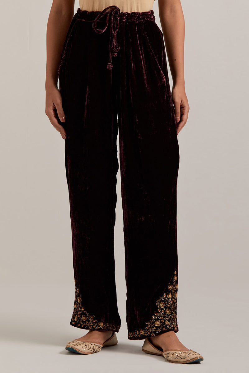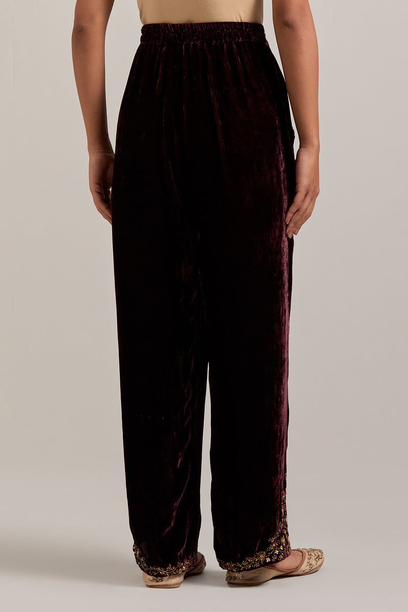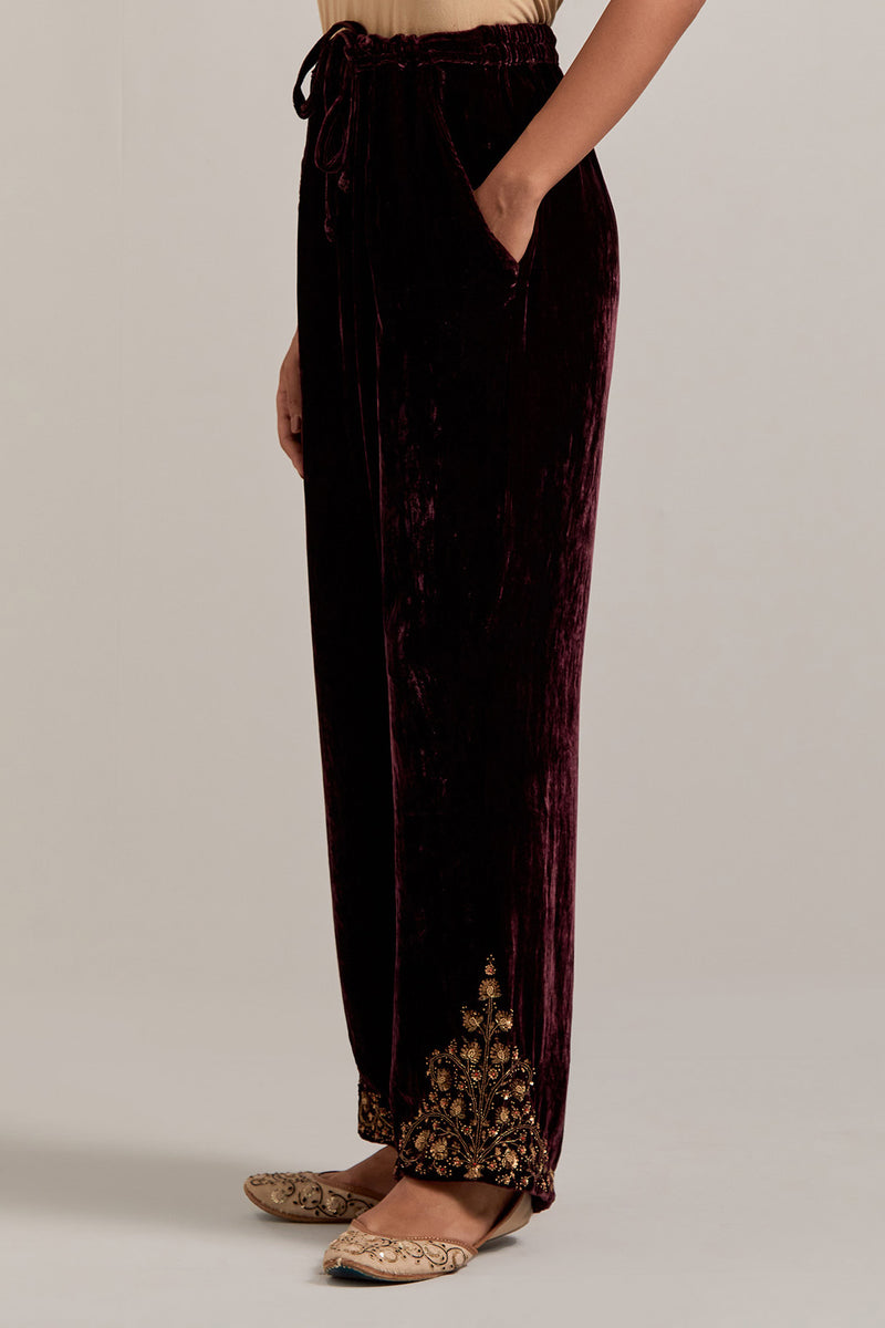 Rich Brown Silk velvet pants, highlighted with hand embroidered bead, sequins, zardozi and zari boota at bottom hem, highlighted with contrast bead work. The waistband is elasticated at the back and has drawstrings in the front for better fitting. It also has side pockets.